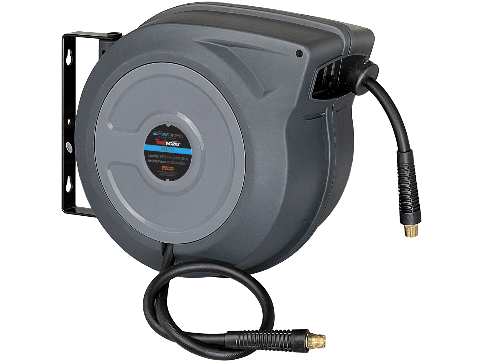 Serie 827 automatisk slangeopruller til luft. Oprulleren er monteret med polymerslange, som tåler et maks. tryk på 20 bar. Slangeoprulleren låser automatisk slangen ved ønsket længde og er udstyret med "Soft Block", som sikrer pålidelig og sikker tilbagerulning af slangen. Boksen er fremstillet af slagfast polypropylene og monteret med et drejeligt væg-/ loftbeslag.