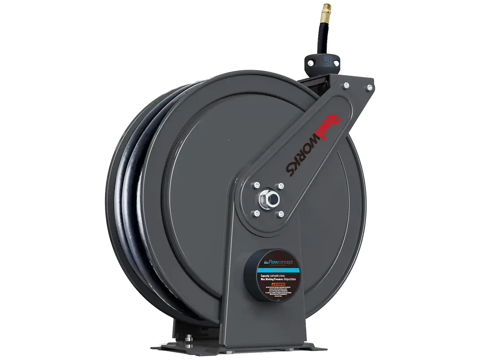 Automatisk slangeopruller med 15 mtr. hybrid polymerslange til luft. Oprulleren er udstyret med dobbelt styrearm, dobbelt monteringsarm og ekstra kraftigt vægbeslag. Sikkerhedsbremse sikrer kontrolleret tilbageløb af slangen, hvilket beskytter både bruger og omgivelser.