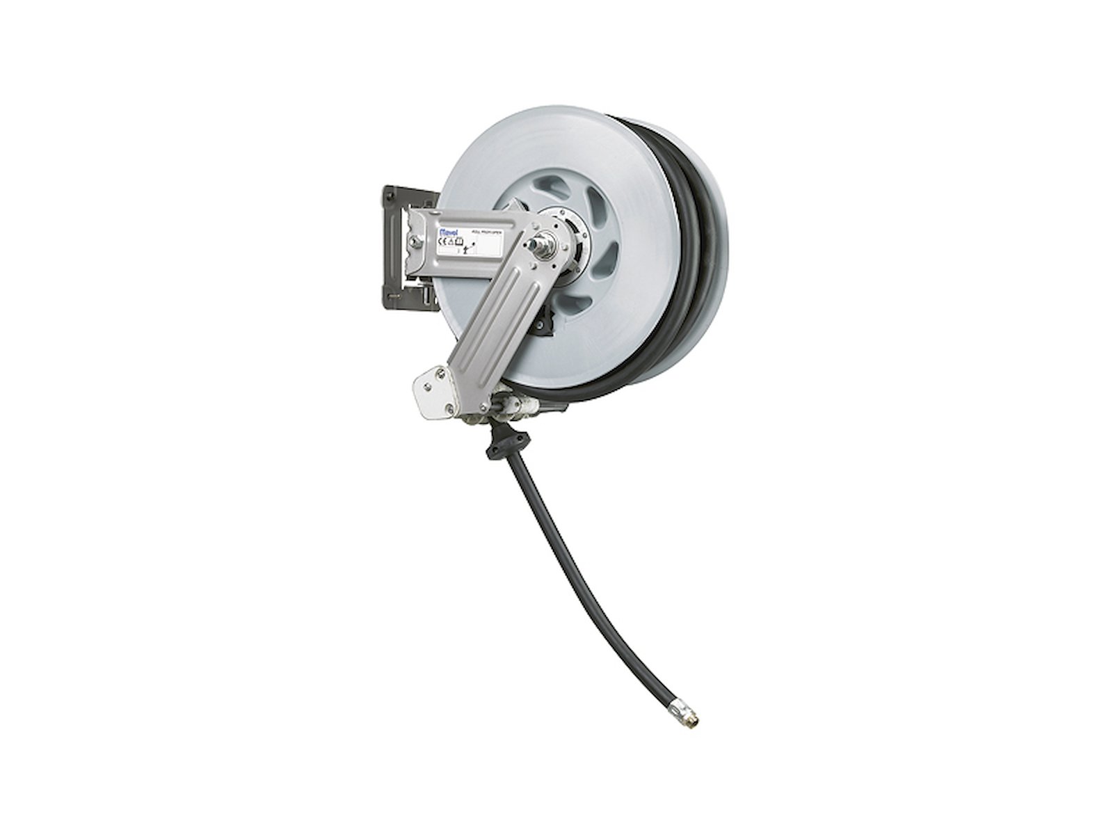 Automatisk slangeopruller til trykluft samt vand op til 40 gr. Den leveres med 180 gr. svingbart væg/loftbeslag og slagfast kabinet. Har automatisk stop, der kan frakobles, så der er konstant træk på slangen. Leveres med gummislange af høj kvalitet