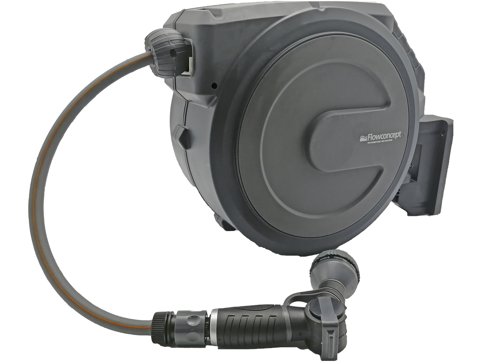 Automatisk slangeopruller for vand. Oprulleren har "soft block" mekanisme og boks udført i slagfast plast med drejeligt vægbeslag. Monteret med blød og kinkfri hybridslange 1/2"×40 mtr. samt 2 mtr. tilslutningsslange og hanenippel til 1/2" og 3/4". Maks. tryk 8 bar. Leveres med multispulepistol.