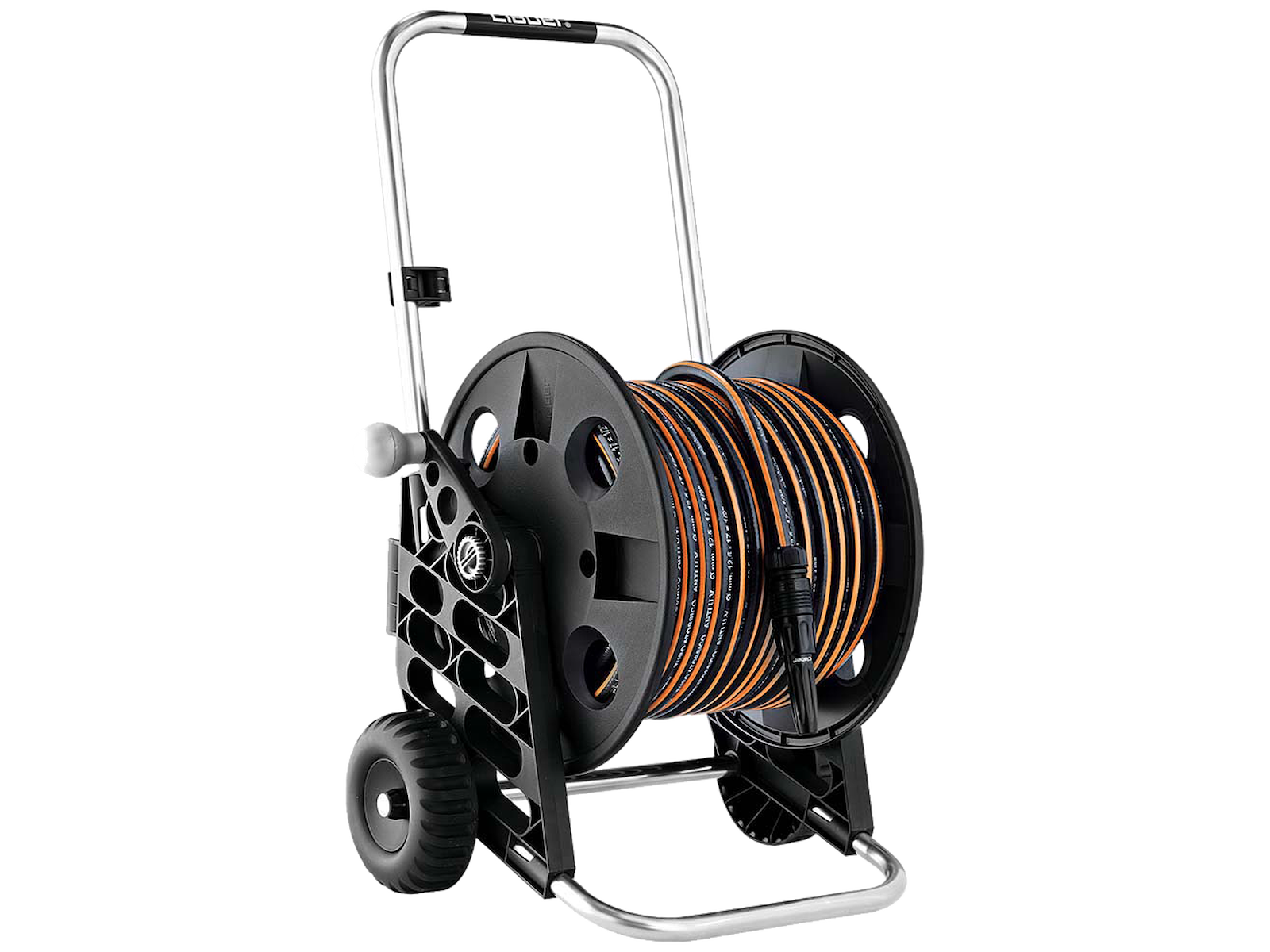 GeniusCompact slangevogn med 30 mtr. ø1/2" (12,5 mm) Top-Sort slange, hanetilslutning, koblinger, sprøjtemundstykke og slangeholderklemme.