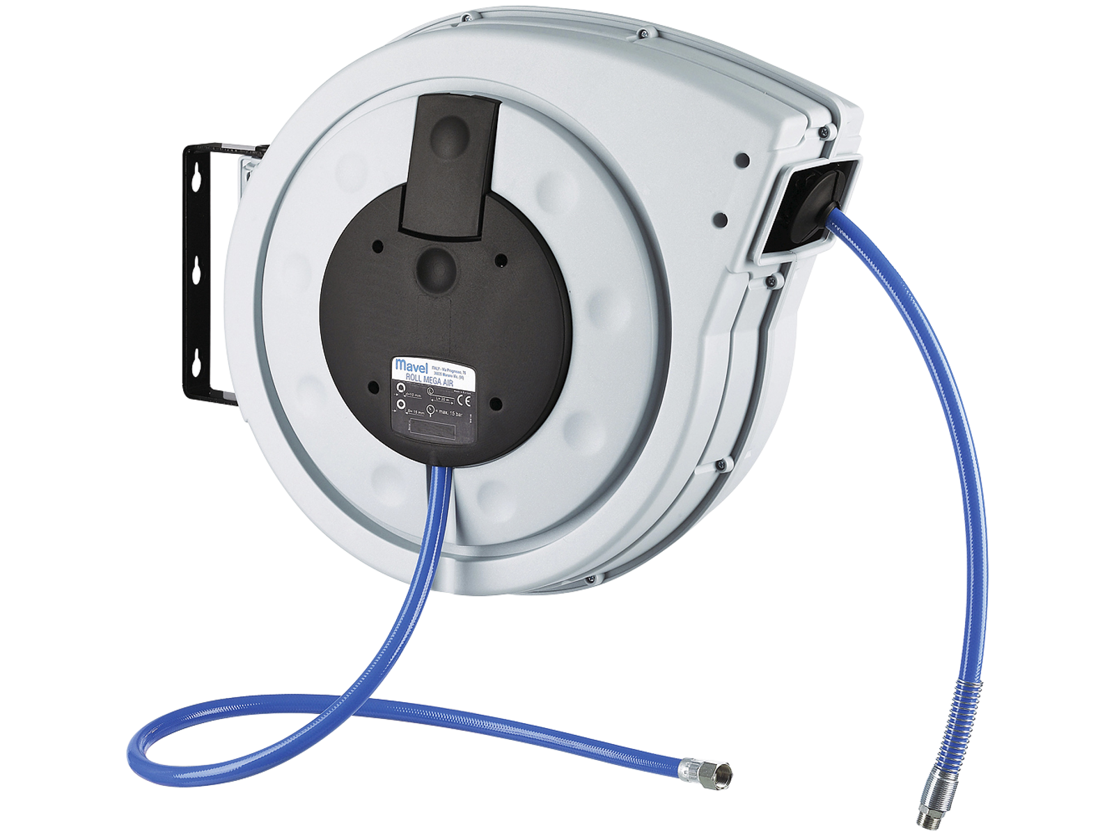Automatisk slangeopruller til trykluft samt vand op til 40°C. Den leveres med 180 grader svingbart væg-/loftbeslag og slagfast kabinet. Har automatisk stop, der kan frakobles, så der er konstant træk på slangen. Leveres med armeret PU-slange.