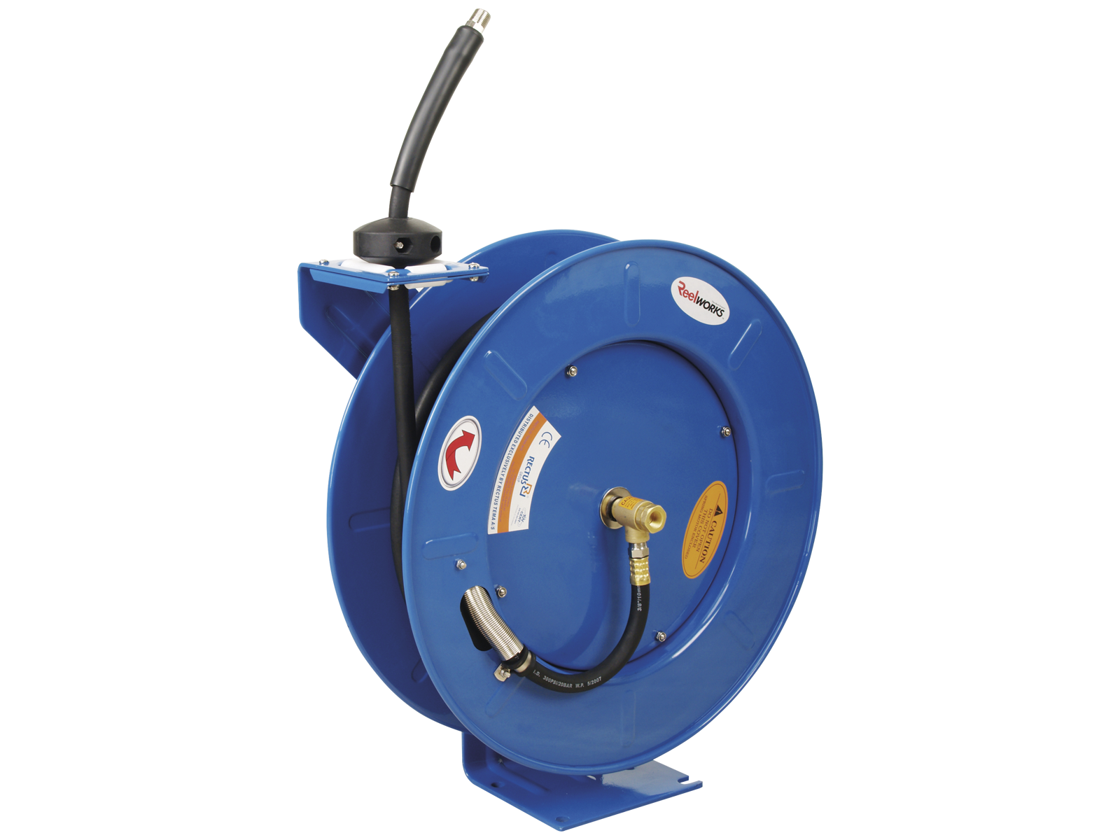 Automatisk slangeopruller velegnet til eks. højtryksrensere. Udført i ekstra kraftig plademateriale med epoxy pulverlakering. Monteret med højtryksgummislange - maks. temperatur 120°C. Forstærket fjeder. Swirvel. Plan pakningsflade. Maks. tryk 276 bar. Medie: vand/hydraulik.