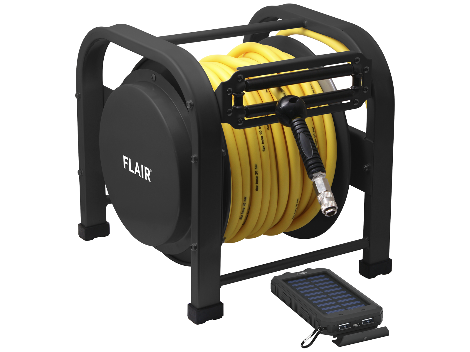 Transportabel, åben selvoprullende slangeopruller med 30 mtr. 3/8" flextrykluftslange med temperaturområde ÷40°C til +60°C. Monteret med kobling og nippel. Tåler op til 20 bar. Leveres på et slagfast stativ med beskyttelsesben. God til f.eks. byggepladser m.m.