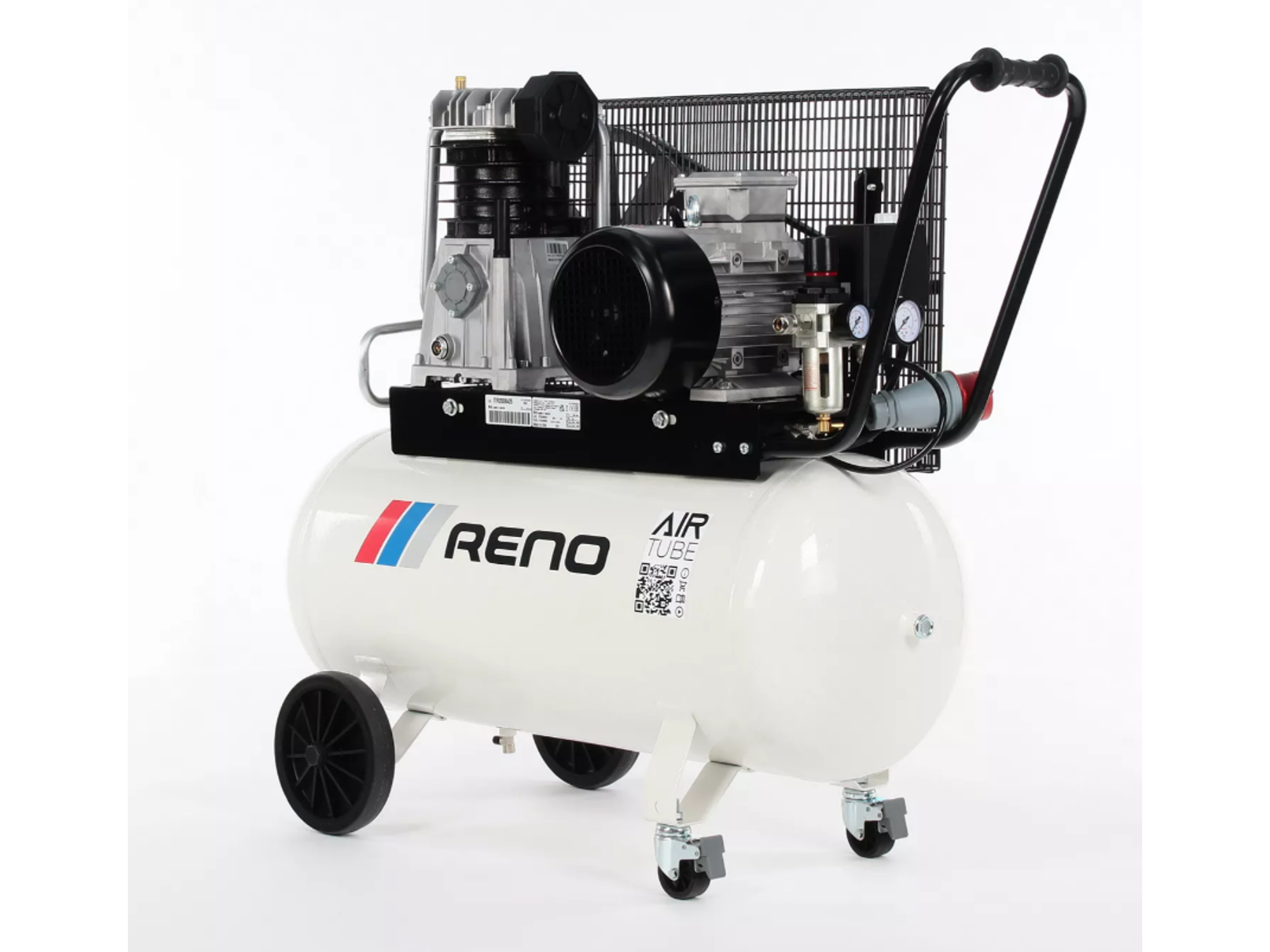 Kompressoren er ekstremt mobil og alsidig, hvilket gør den populær i krævende miljøer. Den har dobbeltdrejende forhjul med bremsesystem og robuste, punkterfrie hjul, der sikrer nem transport og stabilitet. Det ergonomiske håndtag med gummibelægning giver et solidt greb, hvilket gør kompressoren nem at manøvrere.