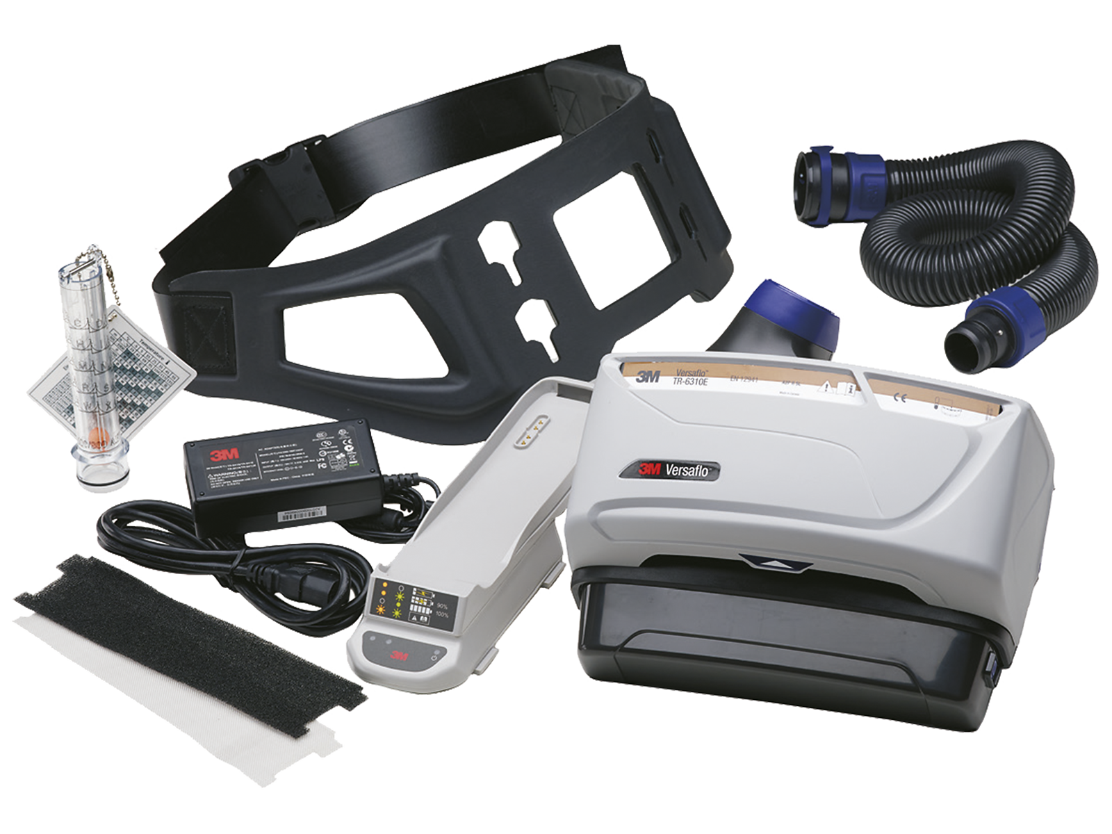 Sættet indeholder TR-602E turboenheden, A2P-filter, filterdæksel, forfiltre, gnistfang, rengøringsvenligt bælte, højkapacitetsbatteri, batteriopladersæt med én oplader, længdejusterbar BT-30 luftslange og luftstrømsindikator