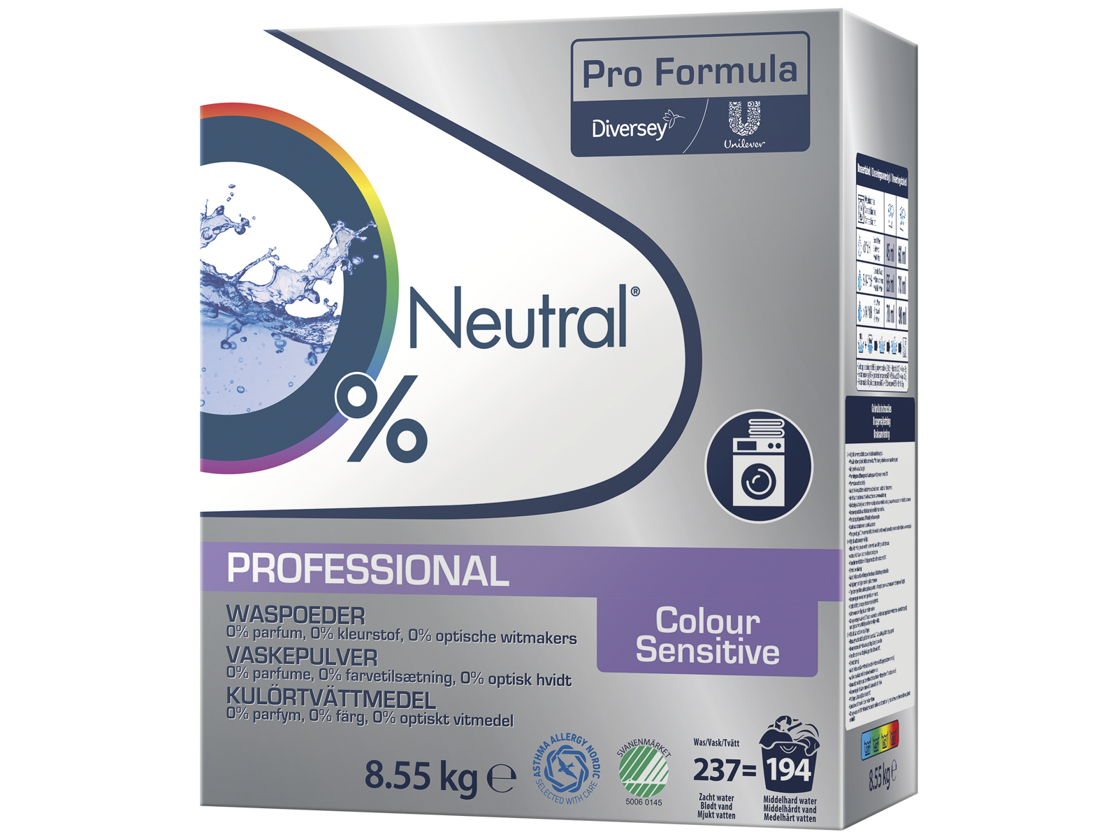 Neutral Professional Color Sensitive vaskepulver uden parfume, farve eller optisk hvidt. Egner sig godt offentlige kunder og virksomheder med miljøbevidst fokus og grønne profiler. Astma Allergy Nordic Selected with care. Svanemærket.