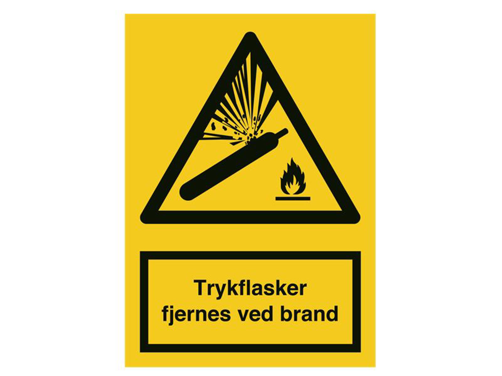 Advarselsskilt "Trykflasker fjernes ved brand" med piktogram og tekst. Selvklæbende vinyl 297×420 mm.