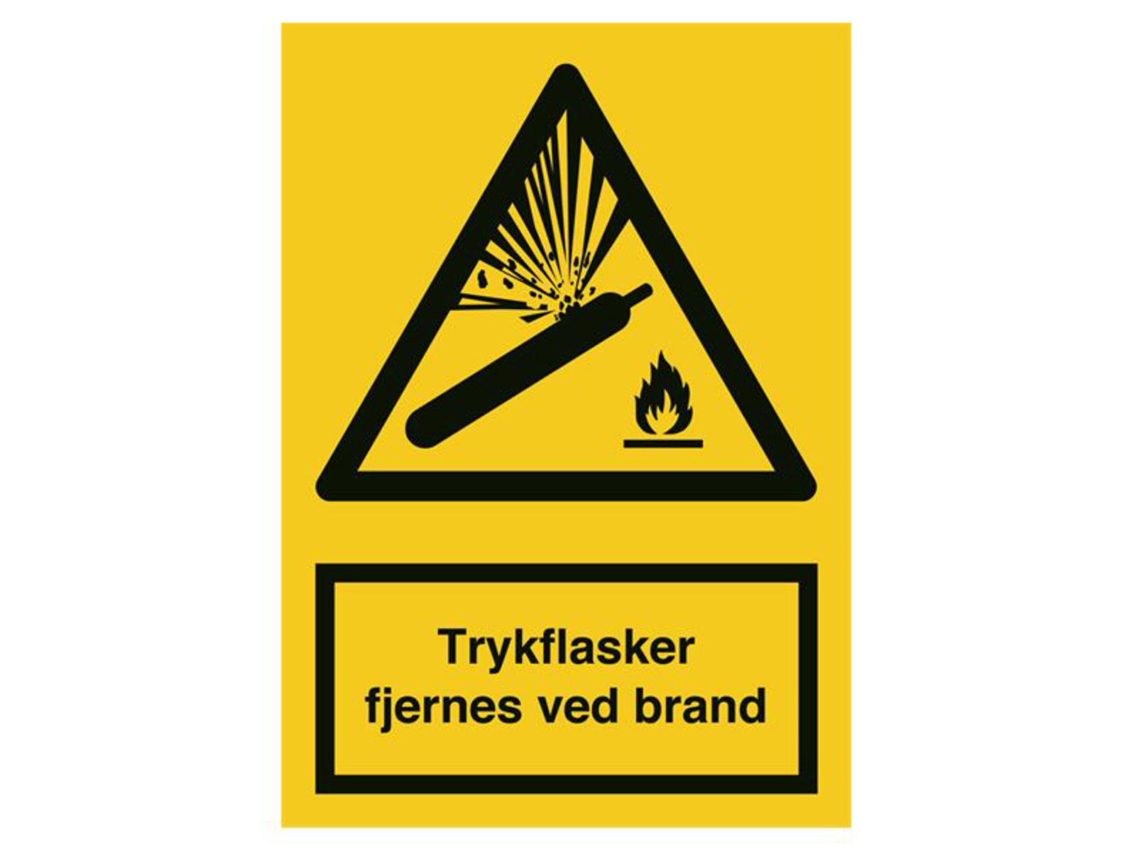 Advarselsskilt "Trykflasker fjernes ved brand" med piktogram og tekst. Plastplade 210×297 mm til opskruning.