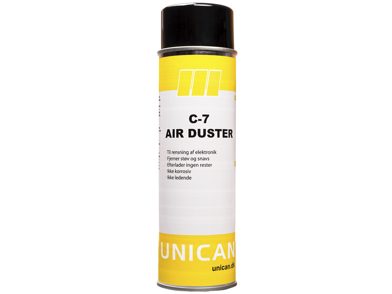 C-7 Air Duster er et produkt, som er specielt udviklet til rengøring af alle former for elektriske komponenter så som printplader, tastaturer, fotoudstyr, optik, kontakter m.m. Produktet fjerner effektivt støv og fremmedlegemer og kan med succes bruges på svært tilgængelige steder. C-7 Air Duster kan med fordel anvendes på alle slags overflader og materialer. C-7 Air Duster skader ikke plastik, glas, lakerede overflader, gummi, metal, stof m.m. Ved anvendelse holdes dåsen lodret. Produktet kan ikke anvendes på hovedet eller i vandret stilling. I det omfang, at et ubrandbart produkt ønskes, kan anbefales Unican C-9 Power Booster.
