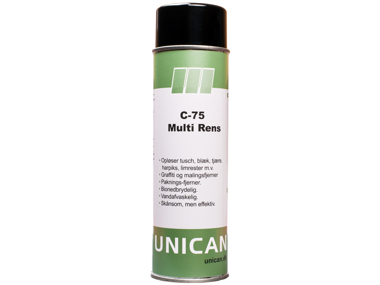 Multirens er et allround affedtningsprodukt, som på grund af dens alsidighed kan løse en lang række yderst krævende affedtningsopgaver i industrien. C-75 Multirens er skånsom overfor langt de fleste overflader, men kan angribe visse lak, gummi og plast-typer. Foretag derfor altid test før brug. C-75 Multirens fjerner effektivt fedt, snavs, tusch, blæk, tjære, harpiks samt paknings-rester og ikke hærdede klæbestoffer. C-75 Multirens påføres i en afstand på 25-30 cm. Lad produktet virke i 5-10 minutter. Afvask efterfølgende med vand eller aftør med ren tør klud.