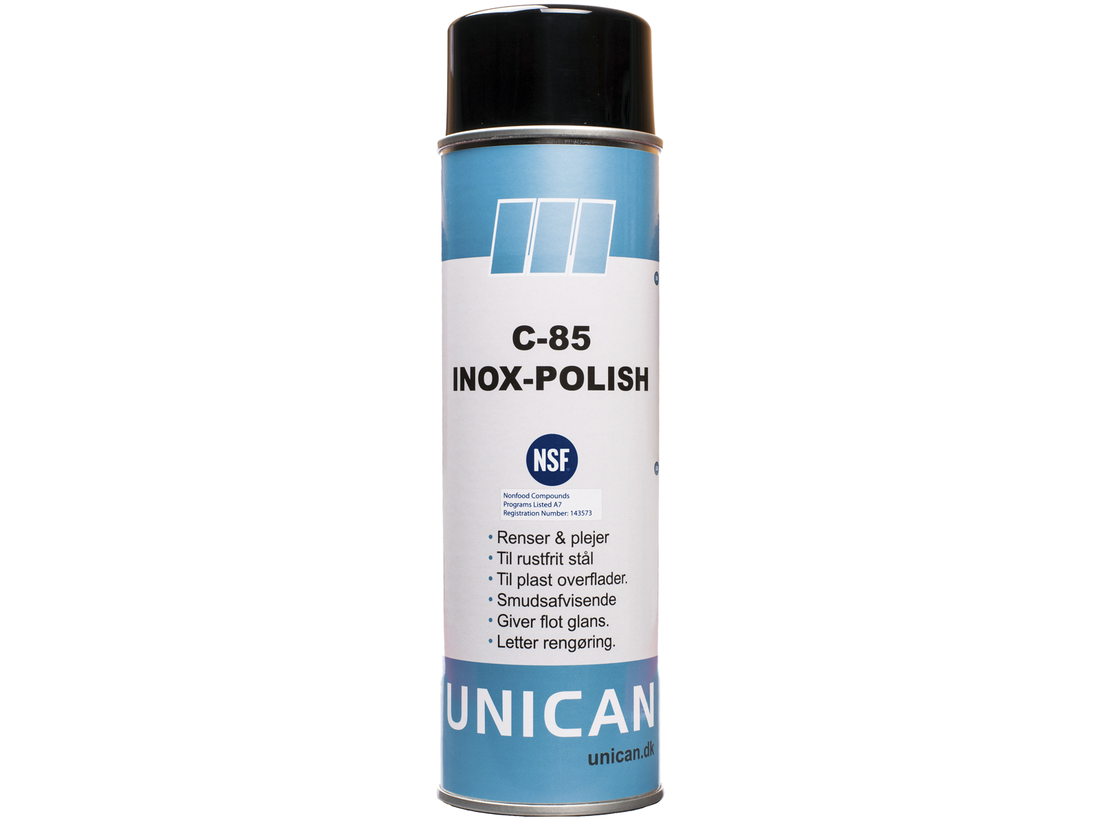 C-85 Inox-Polish anvendes med succes til bibeholdelse samt nyskabelse af flot glans på rustfrit stål og plast overflader. Produktet renser i dybden og fjerner effektivt støv, skidt og andre urenheder samt fingeraftryk på rustfrit stål overflader. C-85 Inox-Polish bevirker endvidere, at overfladen efterlades med en glat smudsafvisende film, som efterfølgende gør rengøring og bibeholdelse af overfladens glans nemmere. Påfør C-85 Inox-Polish i en afstand af 25-30 cm. Lad produktet virke i 1-2 minutter eventuelt længere afhængig af overfladens tilsmudsning. Poler efter med en ren tør klud. C-85 Inox-Polish er frostsikret ned til -20°C.