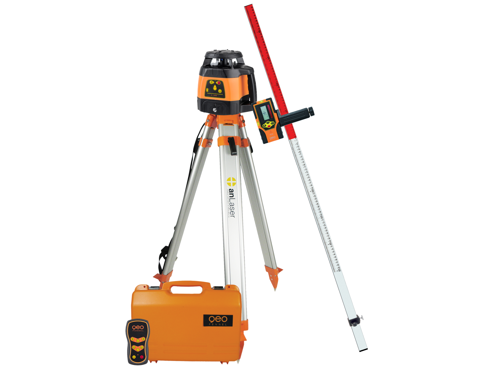 For den ultimative brugervenlighed er de eneste kontrolfunktioner på laseren tænd/sluk knap for laserstrålen og fjernbetjeningen. Alle ekstra funktioner, herunder scannings- og hældningsindstilling, kontrolleres fra fjernbetjeningen. Den robuste fjernbetjening har desuden en rækkevidde på 100 m