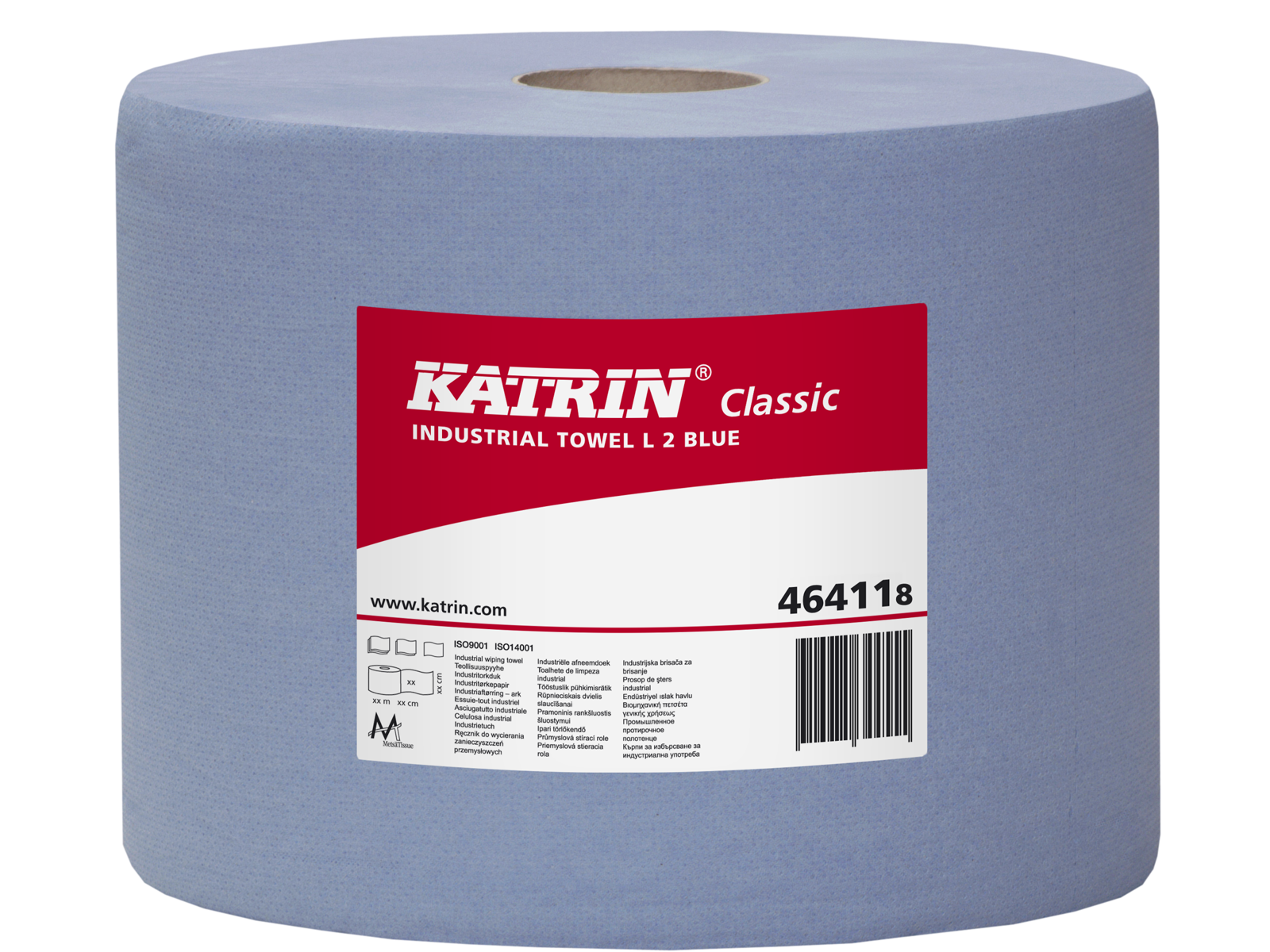 2-lags blåt industripapir til aftørring. Godkendt til håndtering af fødevarer. Mål 22 cm × 380 mtr. Svanemærket.
