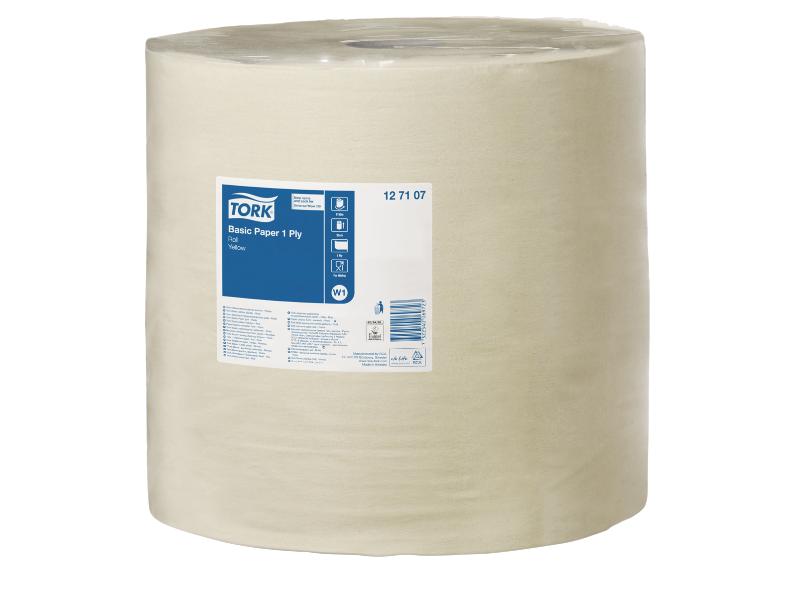 Basic 1-lags aftørringspapir til basisaftørring og håndaftørring. Rulle med stor kapacitet sparer tid på genopfyldning. Papiret kan anvendes enten i Tork gulv- eller vægdispensere (W1).