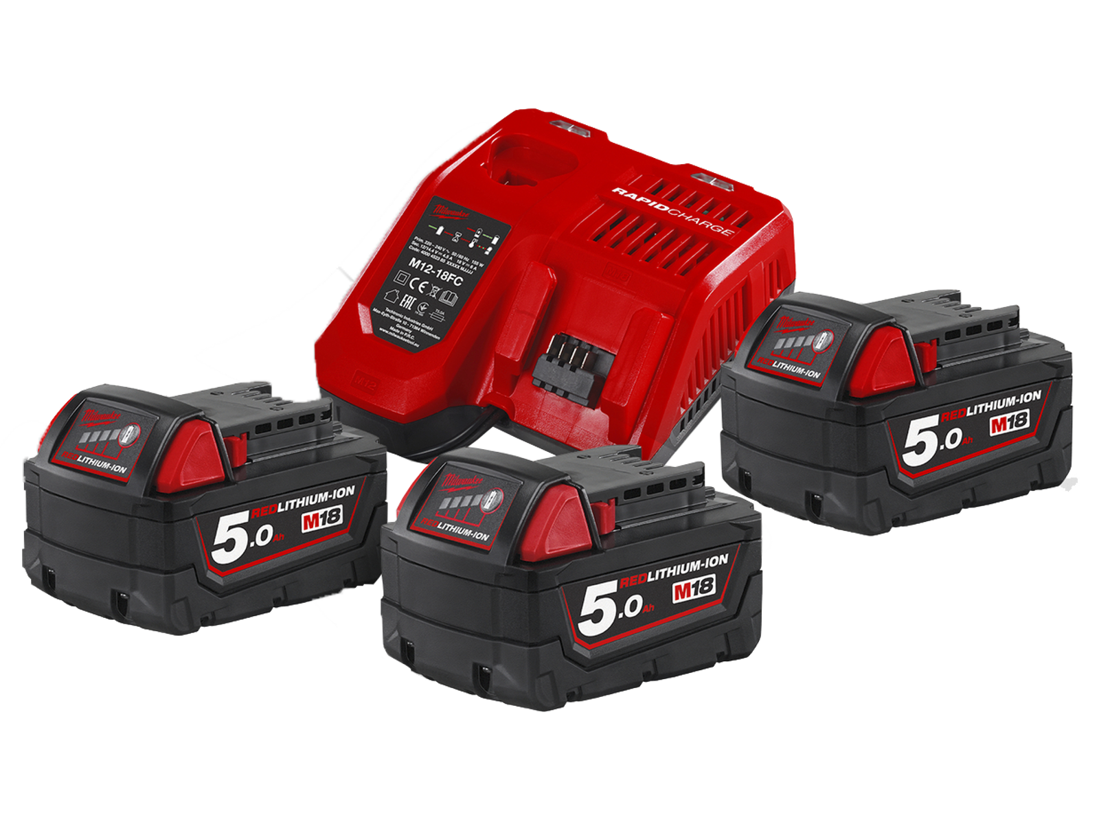 M18 5,0 Ah REDLITHIUM-ION™ startsæt indeholdende 3 stk M18 B5 5,0 Ah REDLITHIUM-ION™ batterier og en M12-18FC lader (59 min.).