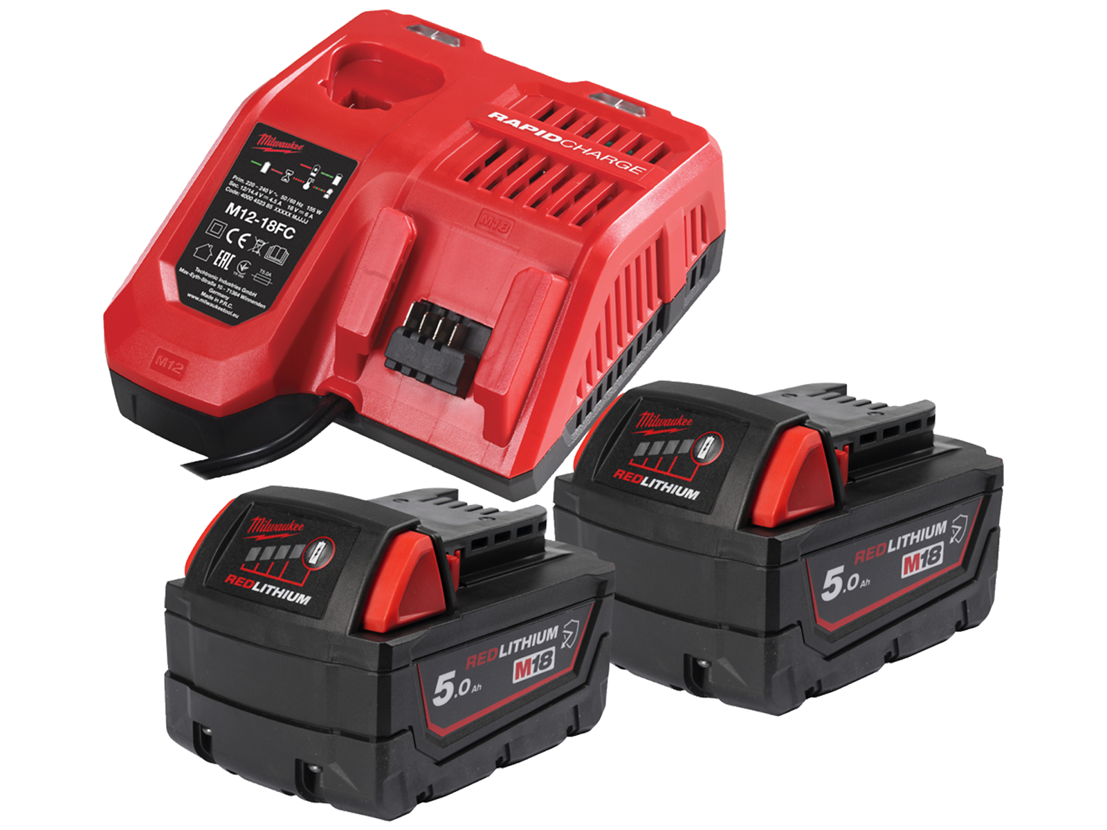 Batteripakke bestående af 2×18 volt 5,0 Ah li-ion batterier samt lader M12-18 FC.