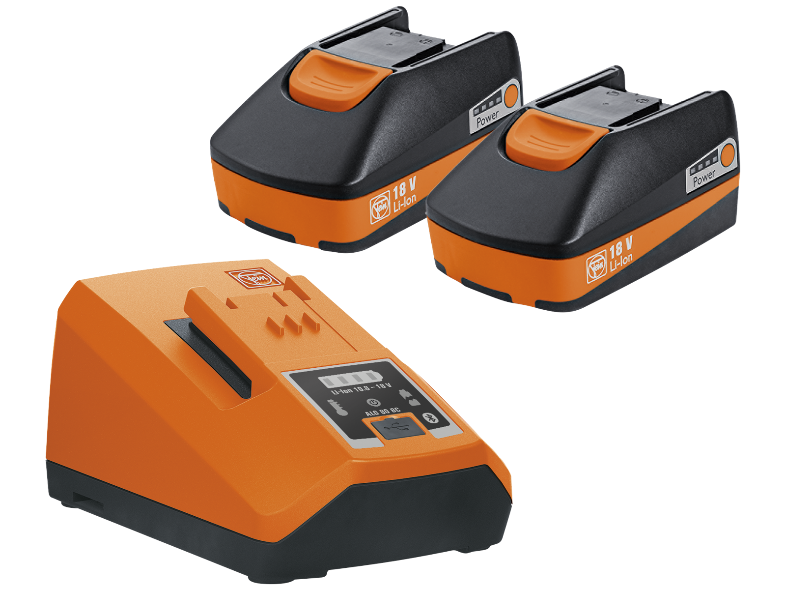 Akku-startsæt med to High Power Li-ion-batterier og hurtiglader ALG 80 BC. Bluetooth-konnektivitet til forbindelse med mobilt udstyr og anvendelse med my.Fein app. Visning på smartphone eller tablet af aktuel opladningsstatus samt samlet antal opladninger. Meddelelse ved fuldt opladet akku. Korte ladetider med høj ladestrøm på 8 Ampere og processtyret opladning. Stort LED-display med visning af opladningsstatus og USB-tilslutning til mobil opladning af små elektroapparater. Til alle Fein Li-ion batterier.