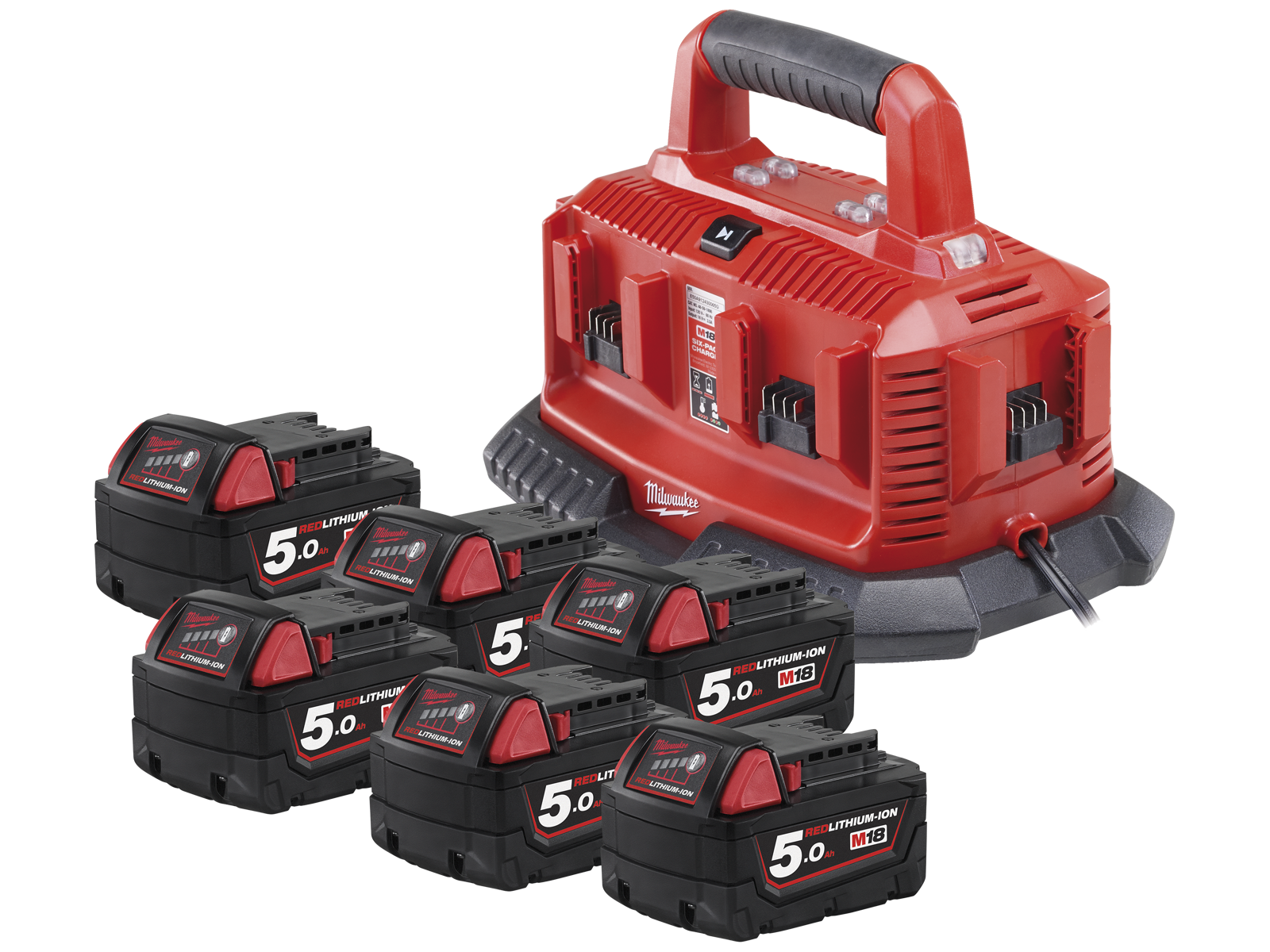 M18 5,0 Ah Redlithium startsæt indeholdende 6 stk. M18 B5 5,0 Ah Redlithium-batterier og en M1418 C6 lader (80 min.). Passer med alle M18 værktøjer.