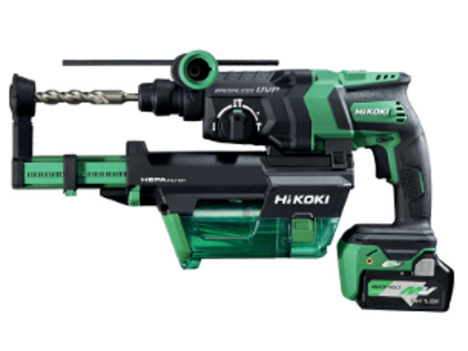 Effektiv og hurtig akku-kombihammer med Multi Volt 36 V batteriteknologi, der yder samme kraft som elektrisk værktøj. Højeffektiv støvopsamlingsenhed med cyklon-system for støvfrit miljø. Blødstart for enkel centrering af borspids. Elektronisk dybdestop. Børsteløs motor giver betydelig øget kapacitet, driftstid og levetid. Med RFC=Reactive Force Control som sikrer brugeren mod vrid i armen ved fastkøring. "3-Mode Function" (Borer, hamrer og mejsler). Leveres med 2 stk. 2,5 Ah Multi Volt batterier, lader, støvsugersystem, dybdestop, sidehåndtag og kuffert.