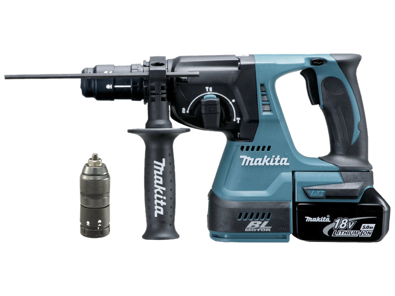 Borehammer med SDS-plus værktøjsopsætning til batteri. Kulløs motor, for længere driftstid. Bremse, højre-/venstreløb, skridkobling og variabel hastighed. Slagstop for boring i træ og metal. Vibrationsdæmpende, gummibelagt greb. Mejselfunktion i 40 indstillinger. Overbelastningsbeskyttelse. Leveres med ekstra selvspændende borepatron, lynlader, 2 stk. 5,0 Ah batterier og MAKPAC systemkuffert.