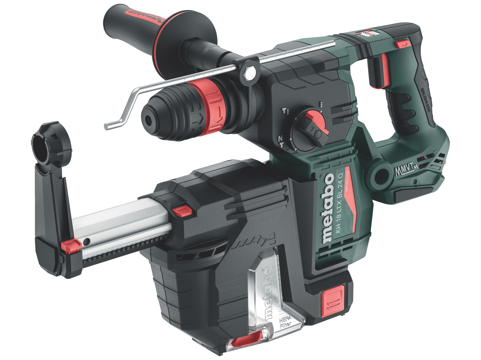 • Meget let, kompakt akku-hammer med kulfri motor til ikke-anstrengende borearbejde i alle arbejdsstillinger. Støvfri boring med kompakt støvudsugning ISA 24. Maksimal boreeffekt, effektivitet og levetid med kulfri teknologi og højeffektivt slagværk. Kombihammer med 3 funktioner: hammerboring, boring og mejsling. Metabo VibraTech (MVT): skånsom for sundheden, modvirker udmatning under arbejdet også ved kontinuerlig drift. Vario-Tacho-Constamatic (VTC)-helperiodeelektronik til arbejde med hastigheder, der passer til materialet og som forbliver konstante under belastning. Elektronisk blød opstart til præcis forboring. Sikkerhedskobling med mekanisk udkobling af motoren, hvis boret blokerer. LED-arbejdslys for optimal belysning af borestedet. Borekapacitet i beton med hammerbor ø24 mm, murværk med borekrone ø82 mm, stål ø13 mm, blødt træ ø30 mm. Kan kombineres med alle 18 V batterier og opladere af CAS-mærkerne: www.cordless-alliance-system.com. Leveres inkl. integreret støvudsugning ISA 24