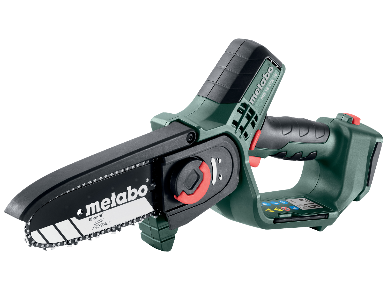 Handy akku-grensav til beskæring af træer og buske samt til beskæring af grønne skud. Sammen med teleskopstang MS (tilbehør) kan minimotorsaven anvendes som grensav i højden. Konstant høj kædehastighed under belastning for hurtigt savearbejde. Op til 60 kraftfulde snit i hårdt træ ø80 mm pr. batteriopladning (Li-Power batteri 18 V/2,0 Ah). Sikkert arbejde med beskyttelsesskærm, gribebeskyttelse og sikkerhedsafbryder til forhindring af utilsigtet start. Nem håndtering takket være kompakt konstruktion, lav vægt og gummibelægning på greb. Kæde med minimalt tilbageslag giver sikre snit og få vibrationer. Nem udskiftning og spænding af savkæde med lynlukning og spændeværktøj anbragt på kabinettet. Saven kan kombineres med alle 18 V batterier og opladere inden for CAS mærkerne: www.cordless-alliance-system.com. Skinnelængde 15 cm. Skærelængde15 cm. Maks. kædehastighed 5 mtr./sek. Savkæde tandform halvmejsel. Savkæde tanddeling 1/4". Drivledstykkelse 1,1 mm. 39 drivled. Leveres inkl. sværd 15 cm, savkæde 15 cm (1/4" LP, 1,1 mm), savkædebeskytter, økologisk savkædeolie 100 ml og sekskantnøgle med kuglehoved. Fås som tool-only eller med batteri og lader.