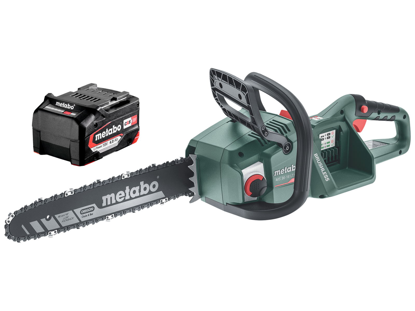 Nem efterspænding og skift af savkæde. Halvtransparent olietank med hurtiglukning for nem kontrol og påfyldning af kædeolie. Robust anslagsklo af metal til optimal styring og kraftbesparende savning. Fældningsliste til præcis pejling af faldretning. Støjsvag batteridrift, kan derfor også bruges på steder, hvor støj er uønsket. 100 % kompatibilitet med 18 V-klassen: effektiv 36 V-drift med to 18 V-batterier fra Metabo. Produktet kan kombineres med alle 18 V batterier og opladere inden for CAS mærkerne: www.cordless-alliance-system.com. Skinnelængde 40 cm. Skærelængde 36 cm. Maks. kædehastighed 22 mtr./sek. Savkæde tandform: halvmejsel/lavprofil. Savkæde tanddeling 3/8" LP. Drivledstykkelse 1,1 mm. 56 drivled. Oliebeholdervolumen 200 ml.