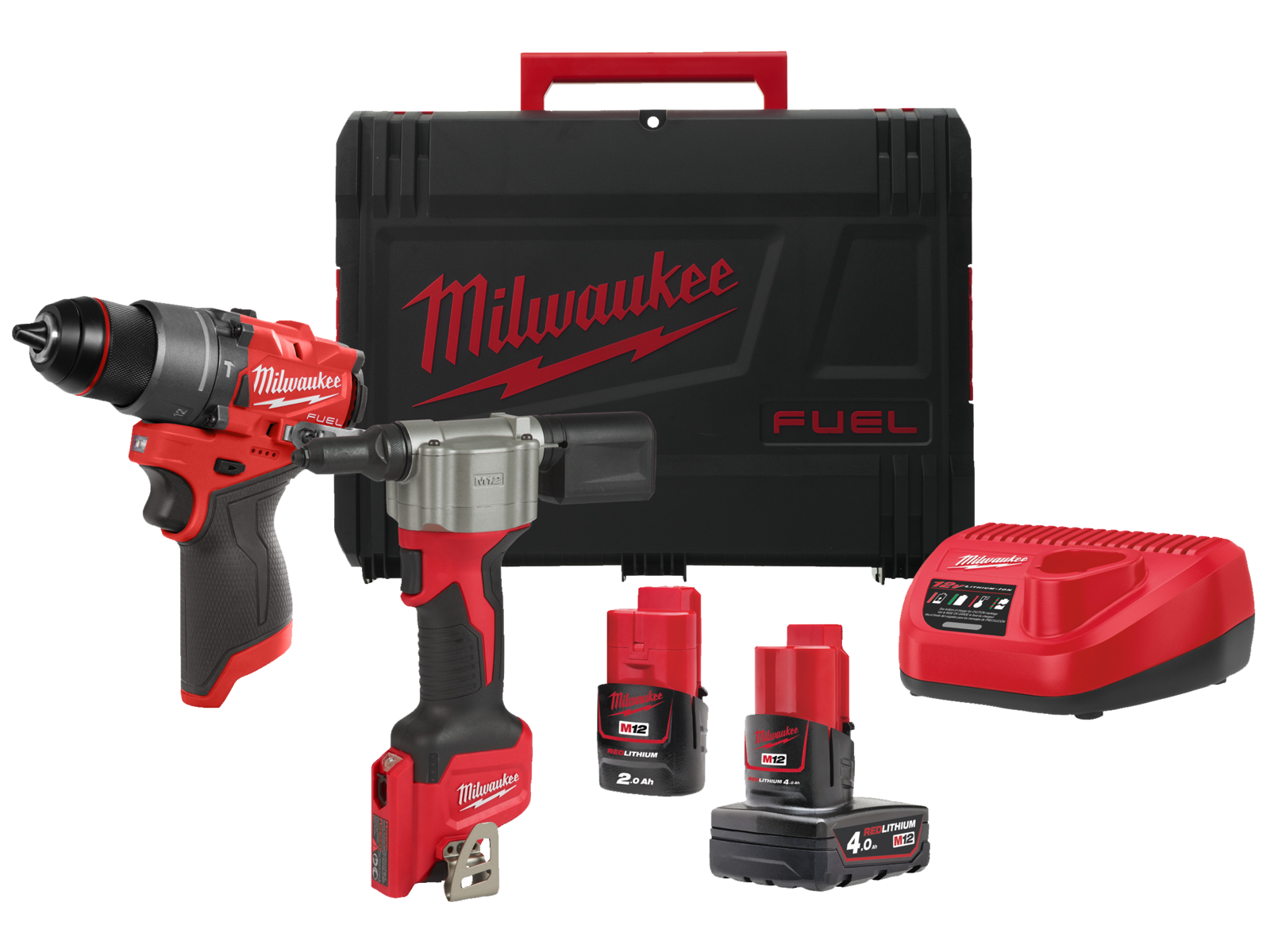 M12 PowerPack maskinsæt med slagboremaskine og nitteværktøj.