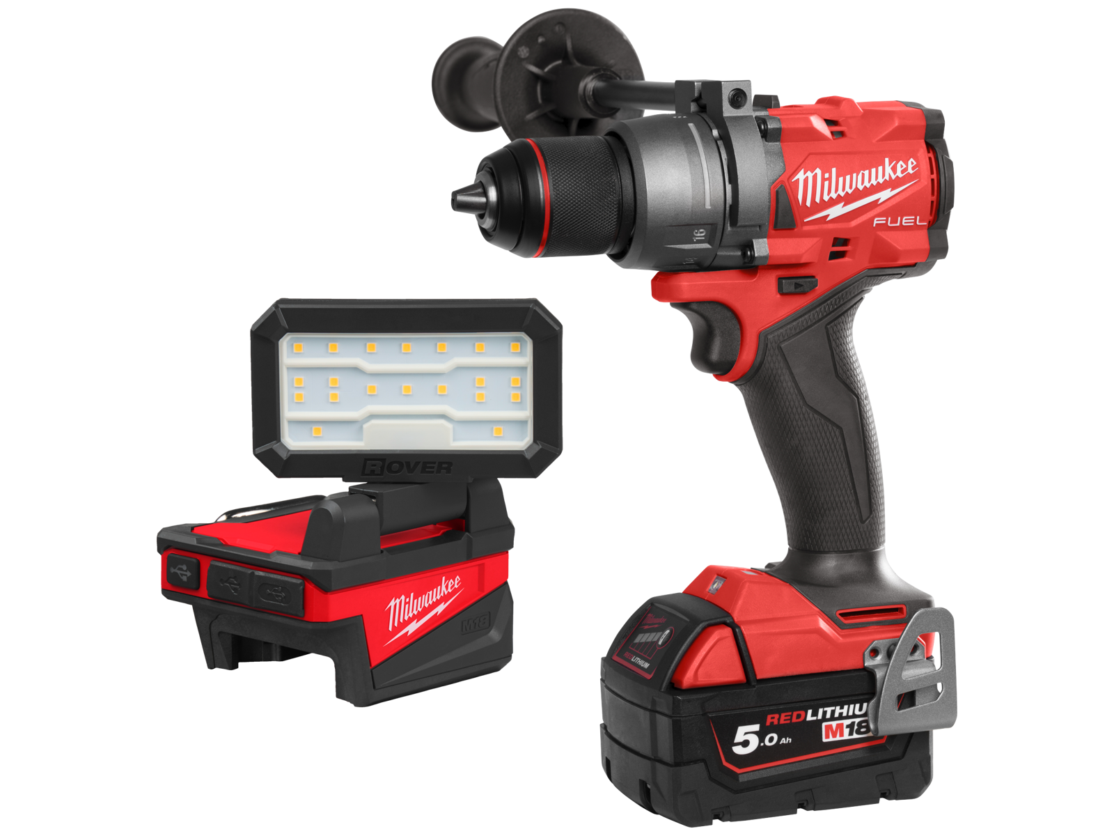Leveres inkl. bælteclips, støttehåndtag, 2× 18 V 5,0 Ah batterier, M12-M18 hurtiglader og HD-boks.