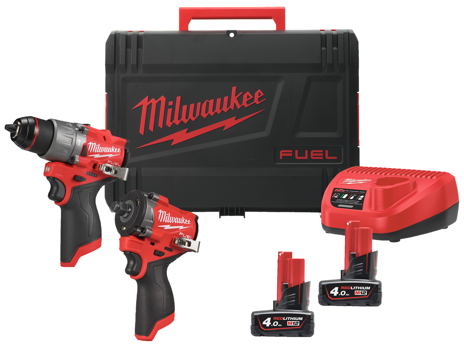 M12 PowerPack maskinsæt med: M12 FPD2 kompakt Fuel slagboremaskine og M12 1/2" kompakt Fuel slagnøgle med friktionsring. Leveres med 2× 4,0 Ah Redlithium-batterier og én 80 min. C12 C lader i HD-boks.