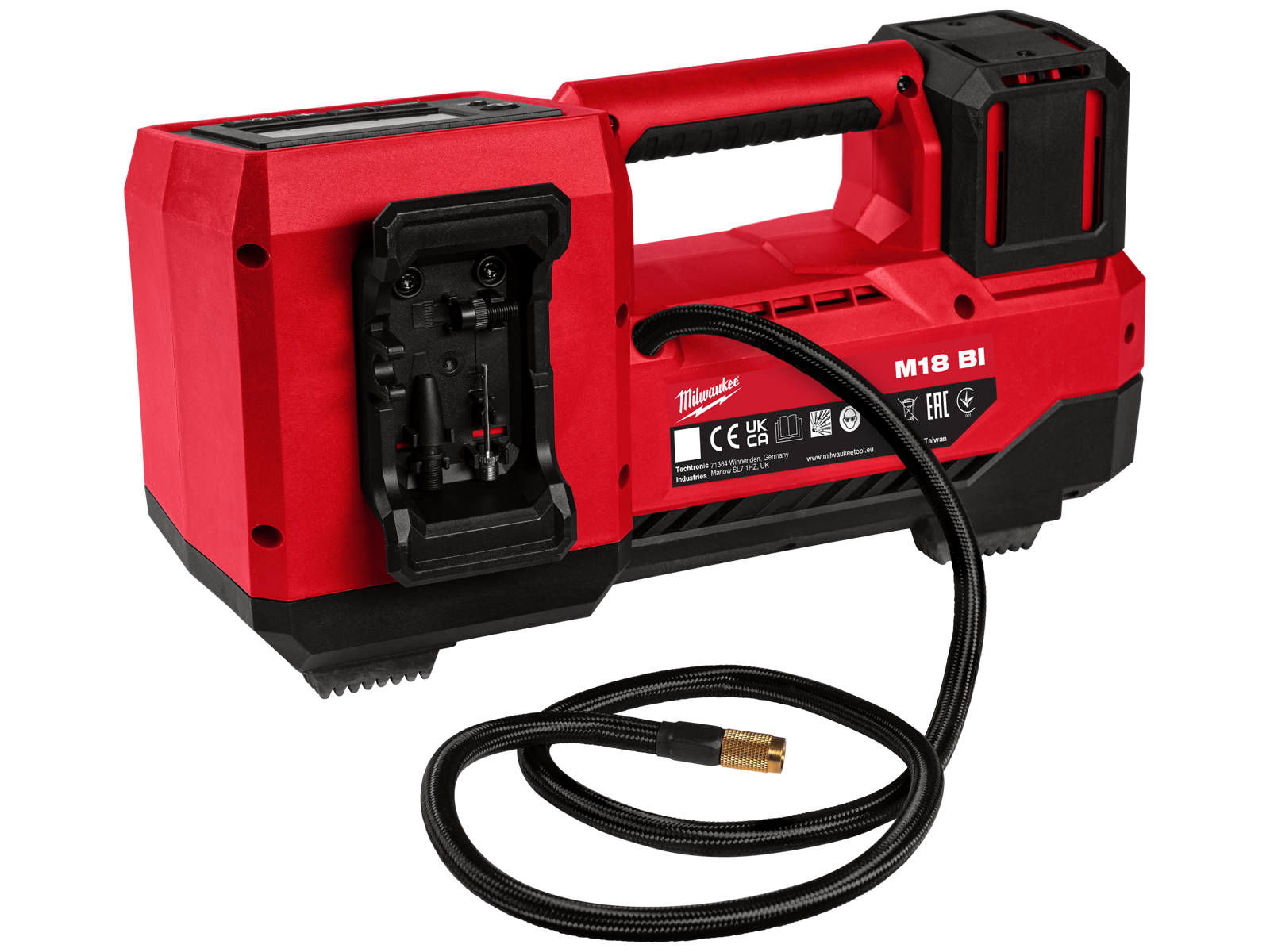 Letvægt M18 luftpumpe til hurtig pumpning af bil- og lette lastbildæk. Automatisk sluk-funktion pumper dækket op til det forud valgte tryk for nøjagtig oppumpning. Pumper op til 30 dæk på et fuldt opladt M18 5,0 batteri. Maks. kapacitet på 10,3 bar. 4 trykindstillinger og 3 måleenheder. Oplyst LCD-display med digital trykmåler. Leveres med pumpenål til bolde, presta fatning, pumpemundstykke og schrader fatning (uden batterier og lader).