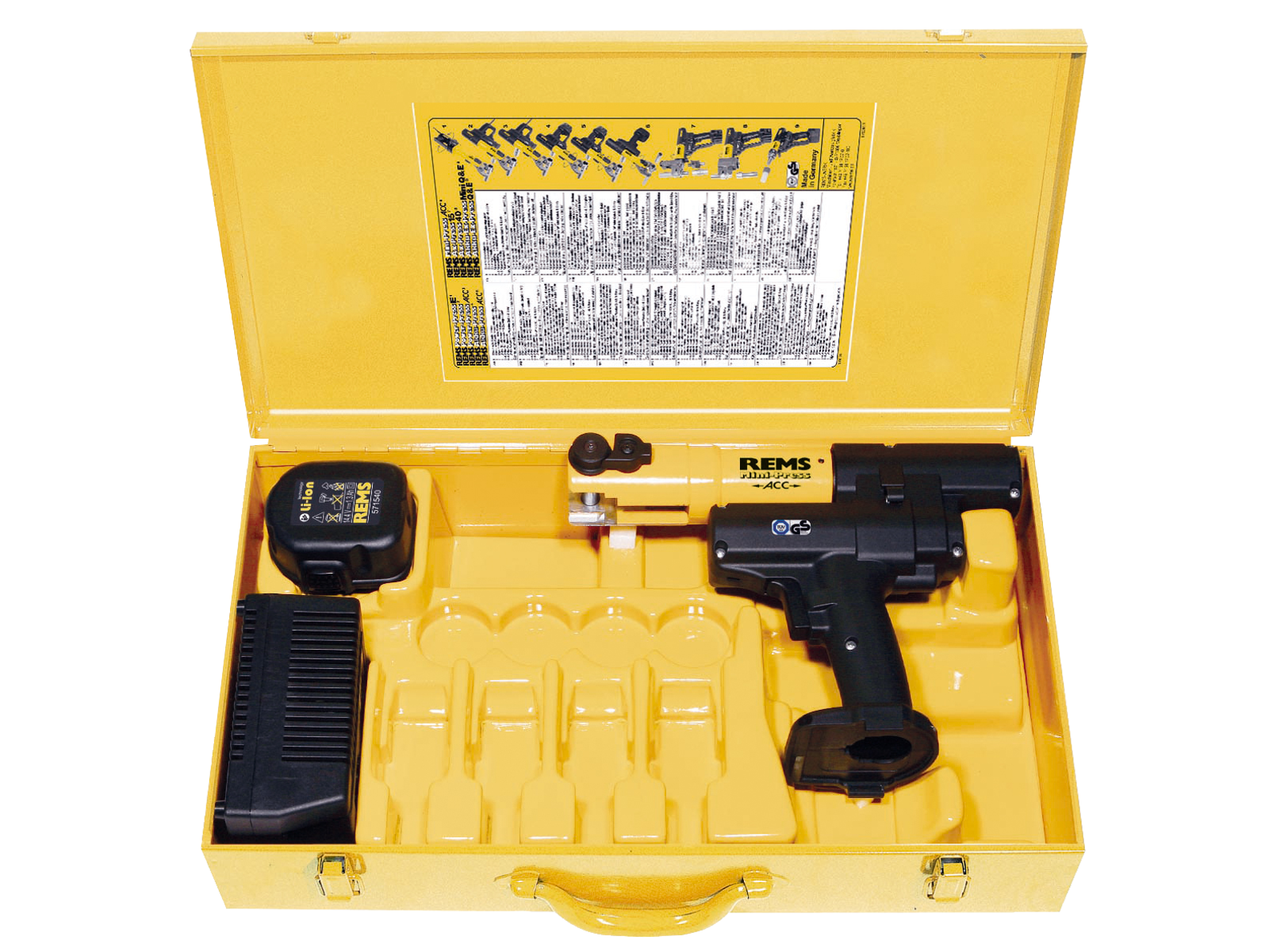Rems Mini-Press ACC Li-ion. Universal op til Ø 40 mm. Let, lille og håndterlig. Med automatisk tilbageløb. Sikkert pressresultat på få sekunder. Automatisk låsning af presstangen.