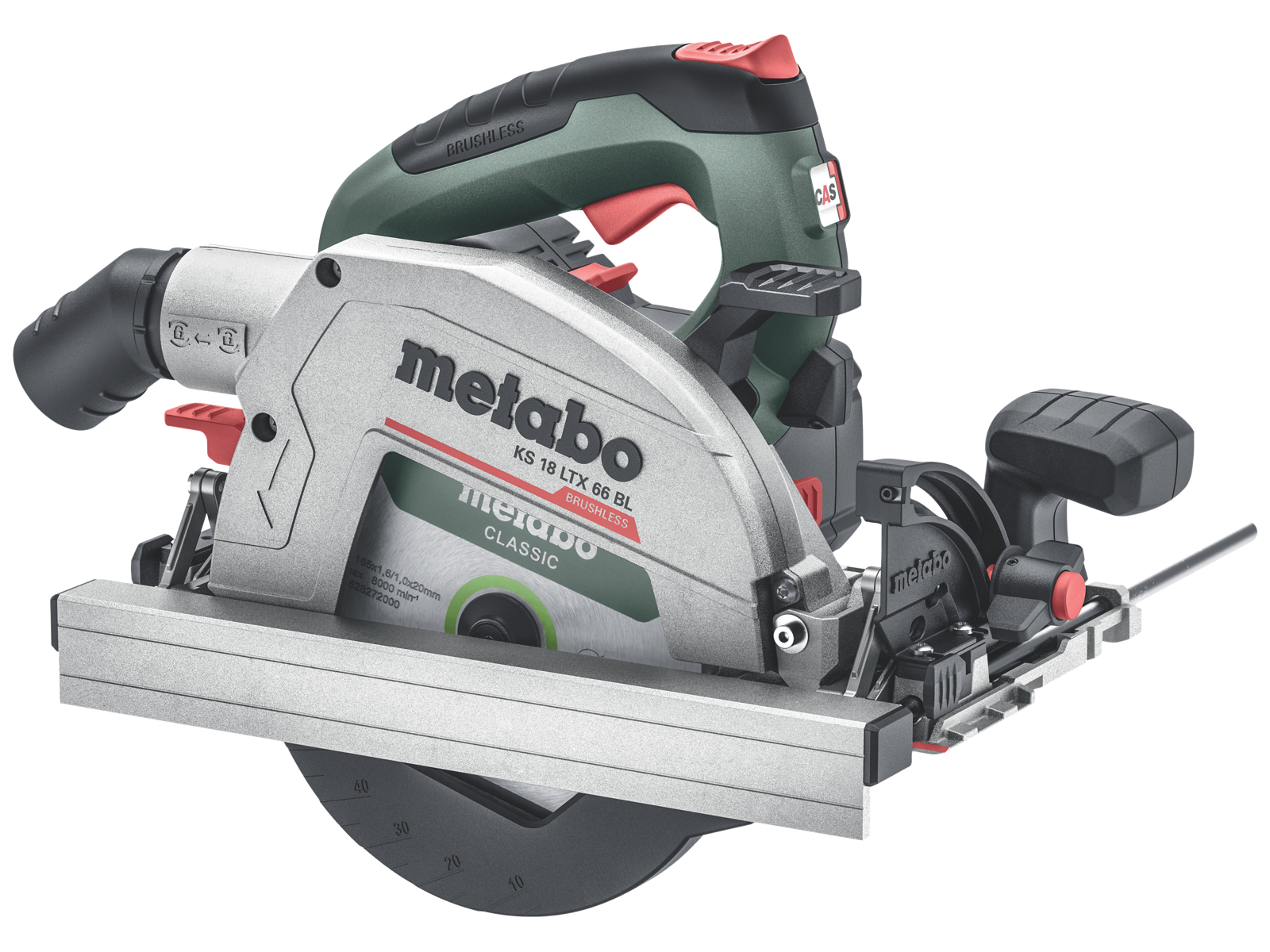 Let akku-håndrundsav med effektivt træk til universel brug på byggepladser. Bundpladen af aluminium kan bruges direkte på Metabos og andre fabrikaters styreskinner.