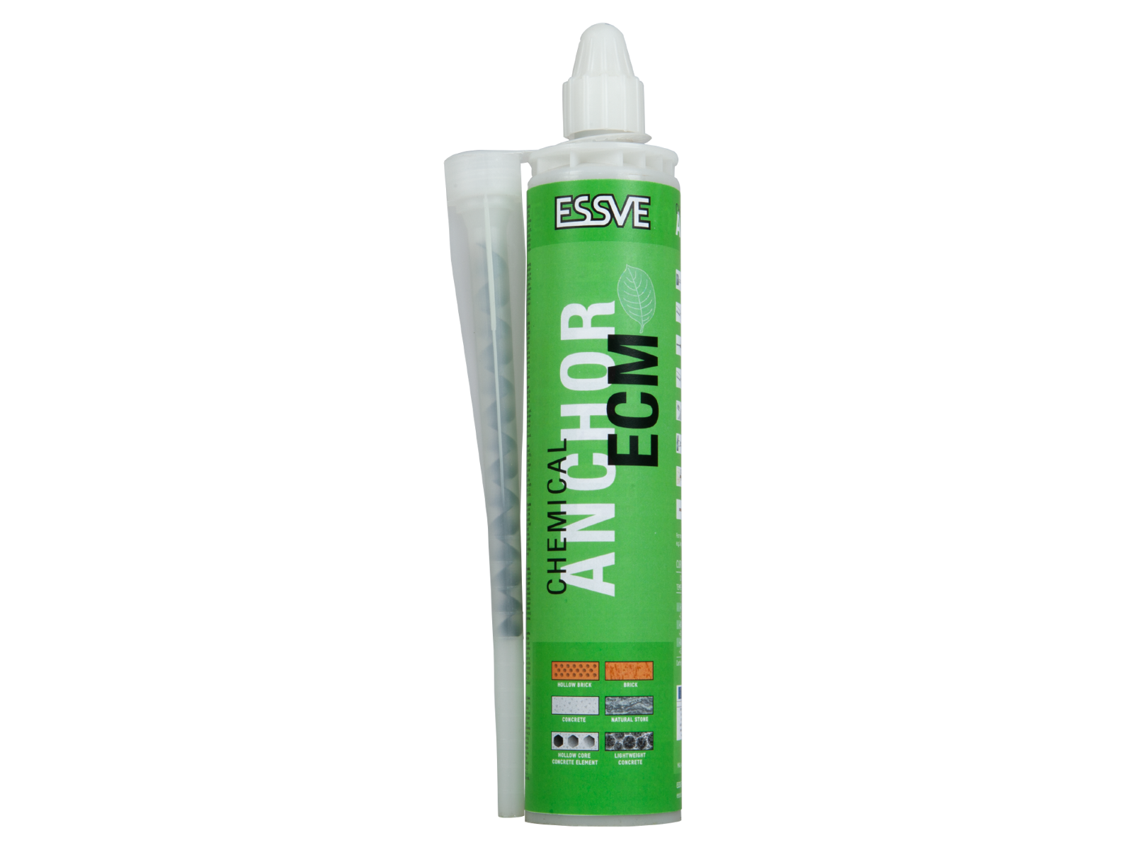 Forankringsmasse ECM 300 ml. Egnet til forankring af gevindstang eller armeringsjern i massive og porøse materialer, såsom beton, natursten, tegl, hulstensmaterialer, lecablok og letbeton. Letbeton går også under navne som leca, ytong, siporex, blåbeton m.fl. Forankringsmasse ECM er en 2-komponents masse, der består af polyesterhartz, hærder og kvartsand. Forankringmasse ECM fås i 3 størrelser, 165 ml, 300 ml og 420 ml. ECM 165 ml og 300 ml appliceres med en almindelig patronpistol. Til ECM 420 ml bruges en Pistolpatron 400 ml. Blandingen af masse og hærder sker i det specialkonstruerede blandingsmundstykke. Korrekt blandet forankringsmasse skal være lysegrå. Borehullet skal altid børstes og blæses rent inden applicering af forankringsmasse. Forankringsmassens funktion bygger på hæftning mod omgivende materiale og det er meget vigtigt at altid efterfølge forankringsmassens monteringsanvisning, meget nøje vedrørende ren-blæsning og børstning af borehul for at fjerne alt betonstøv og bor