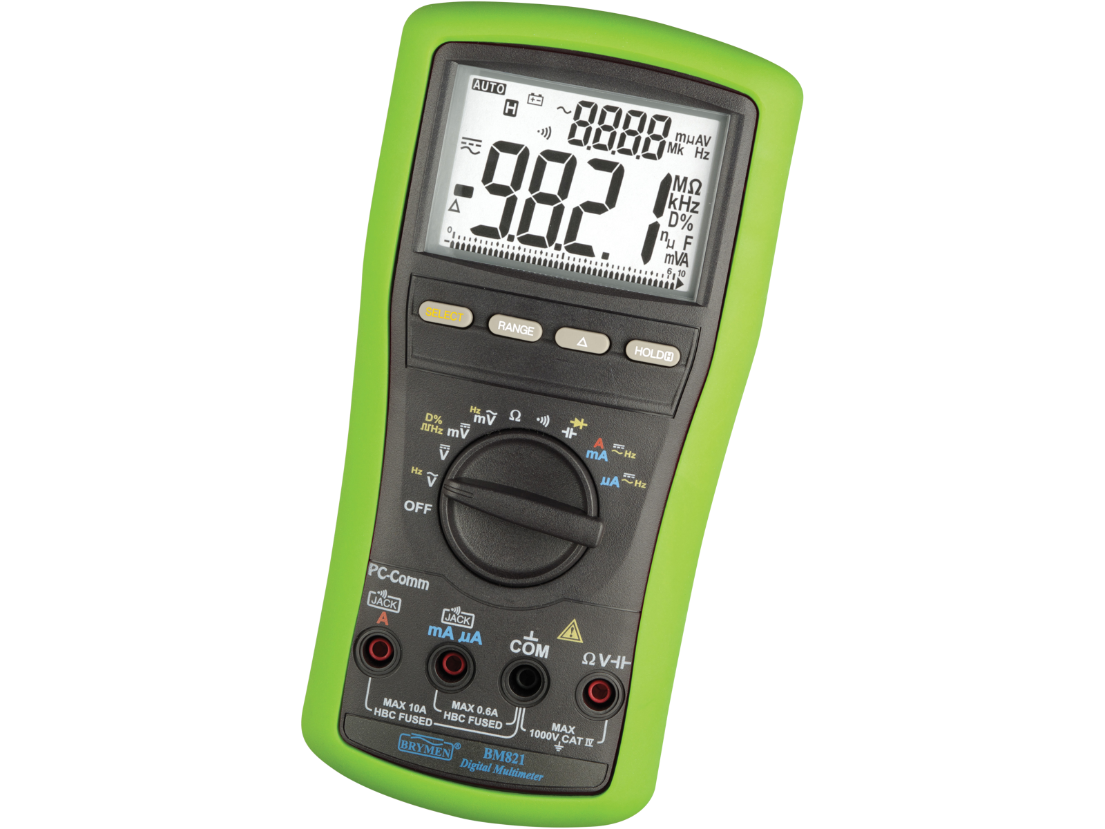 Elma BM 821s er et nyt nøjagtigt og robust kategori IV 1000V multimeter, som på grund af den meget store sikkerhed er velegnet til måling i hele installationen. Elma BM 821s er forsynet med stort tydeligt 4 ciffers dobbelt display og hurtig analog bargraph. Instrumentet måler spænding, strøm, frekvens, modstand, kapacitet, dioder og gennemgang. Elma BM 821s har en række ekstra funktioner bl.a. datahold, autosluk, automatisk/manuelt områdevalg og RS 232 port for PC-kommunikation. Med PC-kommunikationen og Windows software (bestilles separat), er det muligt at foretage ON-Line datalogning, hvor de målte data kan vises som: Digitalt display, analogt display, kurve/graf og tabel. Instrumentet er UL listet, opfylder IEC 61010-1 KAT IV 1000V og forsynet med højeffektive sikringer med kontrolfunktion. Elma BM 821s leveres komplet inkl. dansk betjeningsvejledning, batteri, testledninger og robust gummibeskyttelseskappe.