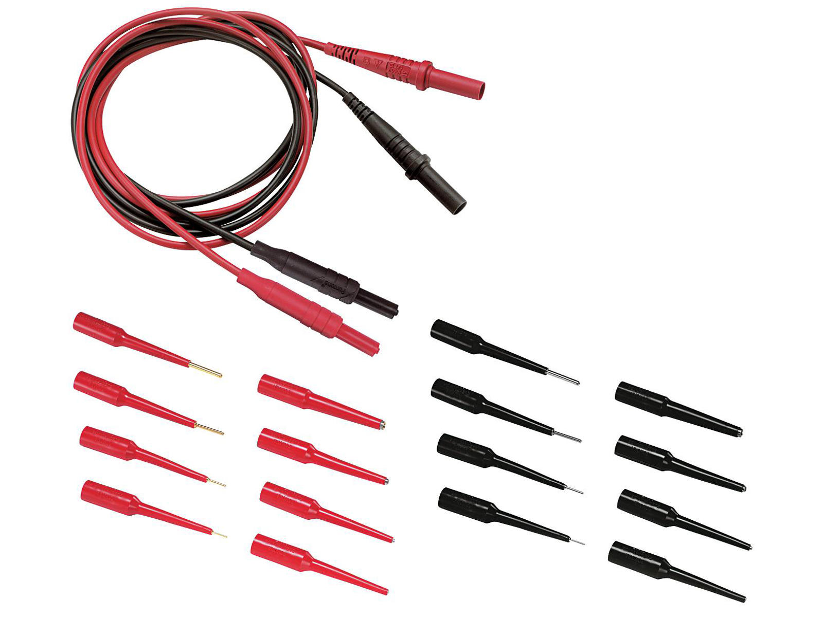 Pakken indeholder testkabler, der kan trækkes ind og er beskyttede, komplet opsætning med 8 adaptere til han- og hunstik med fleksible spidser, samt en rød og en sort spids i forskellige størrelser. Klassificeret til 60 V DC.