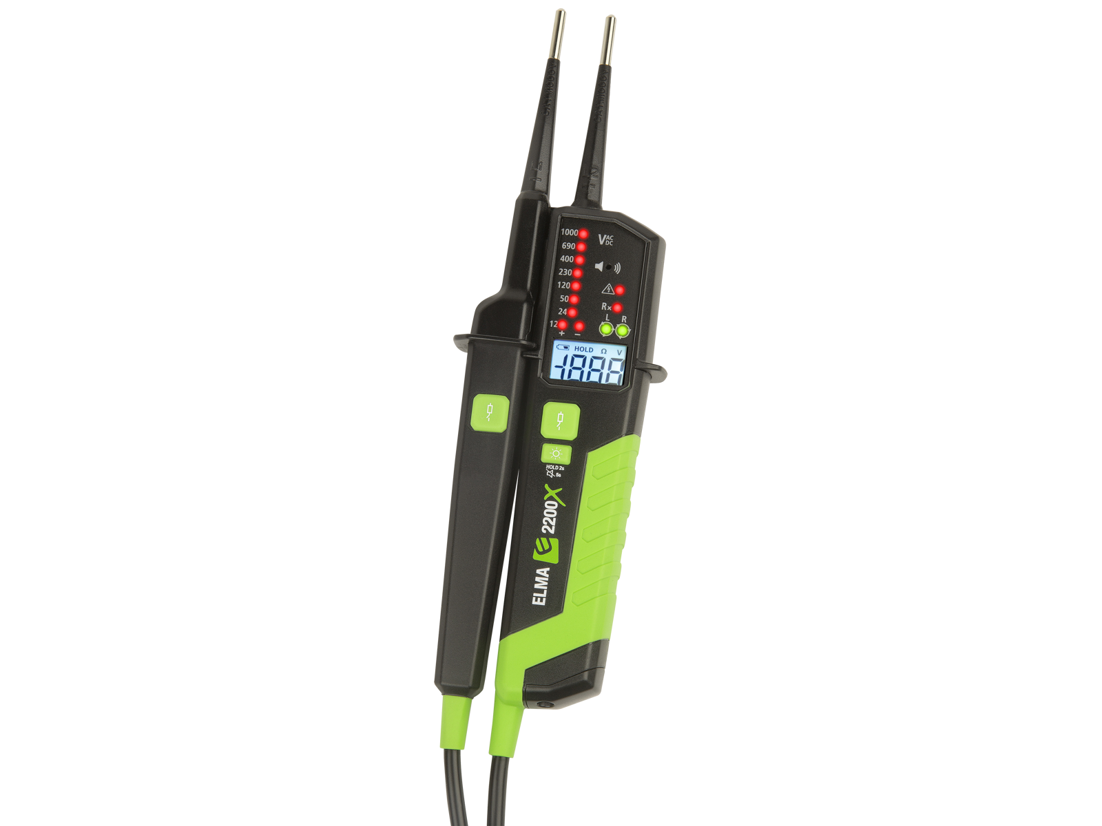 Elma 2200X spændingstester med prøveledninger i ekstra kraftig kvalitet. Højeste sikkerhedskategori IV: kan belaste målepunkt og har ekstra stort måleområde for DC til hele 1.500 V gør testeren velegnet til at måle på drivspændingen på elbiler og hybridbiler samt PV solceller. Velegnet til de fleste elektrikeropgaver, L-AUS arbejde og konstatering af spændingsløs tilstand, hvor det er lovpligtigt at anvende et instrument, som overholder spændingstesterdirektivet. Perfekt til måling på ladestik og ladestandere EVSE til elbiler. Spændingstest, 2 polet med lysdioder 12-1.000 V AC/DC. Spændingsmåling med digital visning 6-1.000 V/1.500V AC/DC. Gennemgangstest. Modstandsmåling 0-1.999 ?. Polsøger, et-polet spændingstest som indikerer fasen. Fasefølge-/drejefelt test, 2 polet for 3 faset net. Stor tydelig belyst display og højeffektive lysdioder. Selvtest- og auto on/off funktion. Advarsel med diode ved farlig spænding uden batteri for L-AUS arbejde. Opfylder spændingstesterdirektivet for kontrol af spændingsløs tilstand. Meget kraftige fastmonterede ledninger. Udskiftelige prøvespidser 2/4 mm. Indbygget kraftig lommelygte. Opfylder IEC 61010-1 KAT IV 600 V / IEC 61243-3:2014. Leveres komplet med batterier og vejledning.