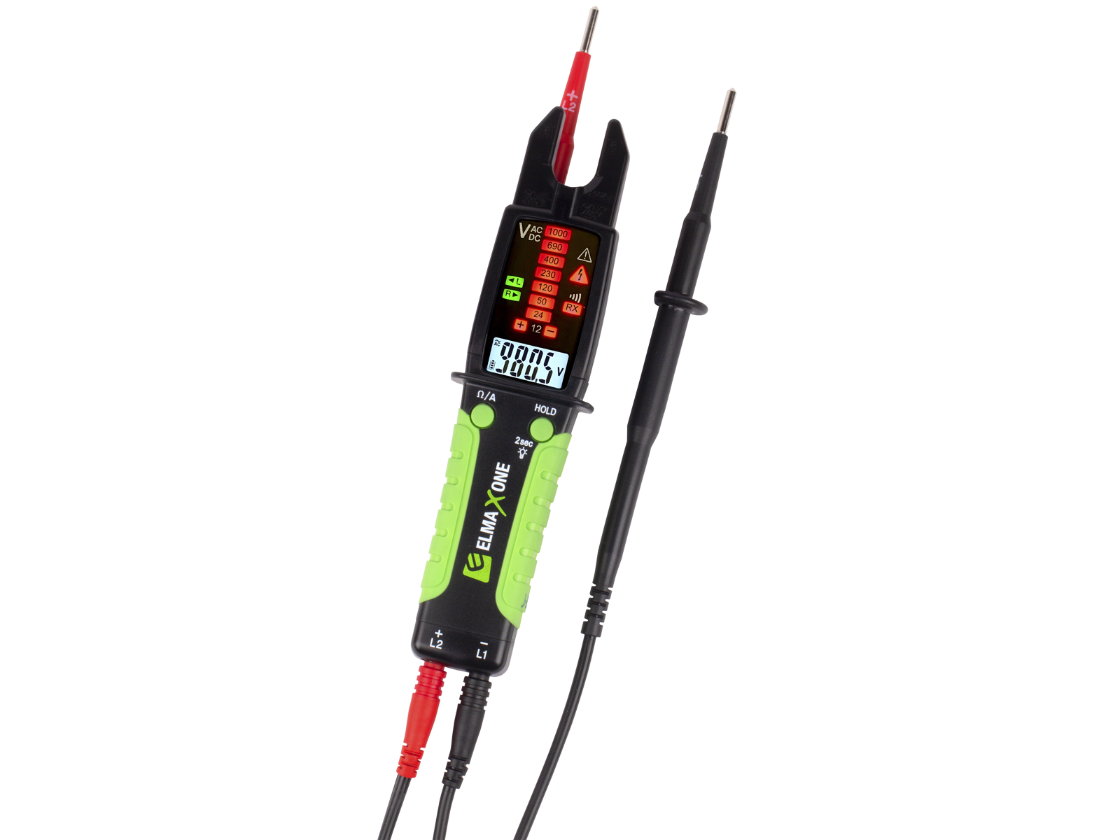 Elma X One er en smart sand RMS multitester, som kombinerer spændingstesteren med en åben strømtang i meget slankt design. Velegnet til L-AUS arbejde. Spændingstest, 2 polet med lysdioder 12…1.000V AC/DC. Sand RMS spændingsmåling med digital visning 7…1.000V AC/DC. Sand RMS strømmåling med super slank strømtang 0-200A. Modstandsmåling 0-50 k.ohm og gennemgangstest. Polsøger, et-polet spændingstest som indikerer fasen. Fasefølge-/drejefelt test, 2 polet for 3 faset net. Stort tydeligt belyst display og højeffektive lysdioder. Selvtest- og auto on/off funktion. Ægte spændingstest også uden batteri. Opfylder spændingstesterdirektivet for kontrol af spændingsløs tilstand. Meget kraftige udskiftelige ledninger med 4 mm standard bananstik. Udskiftelige prøvespidser 2/4 mm. Indbygget kraftig lommelygte. IEC 61010-1 KAT IV 600V / IEC 61243-3:2014. Leveres komplet med batterier, prøveledninger, vejledning og smart bæltetaske.