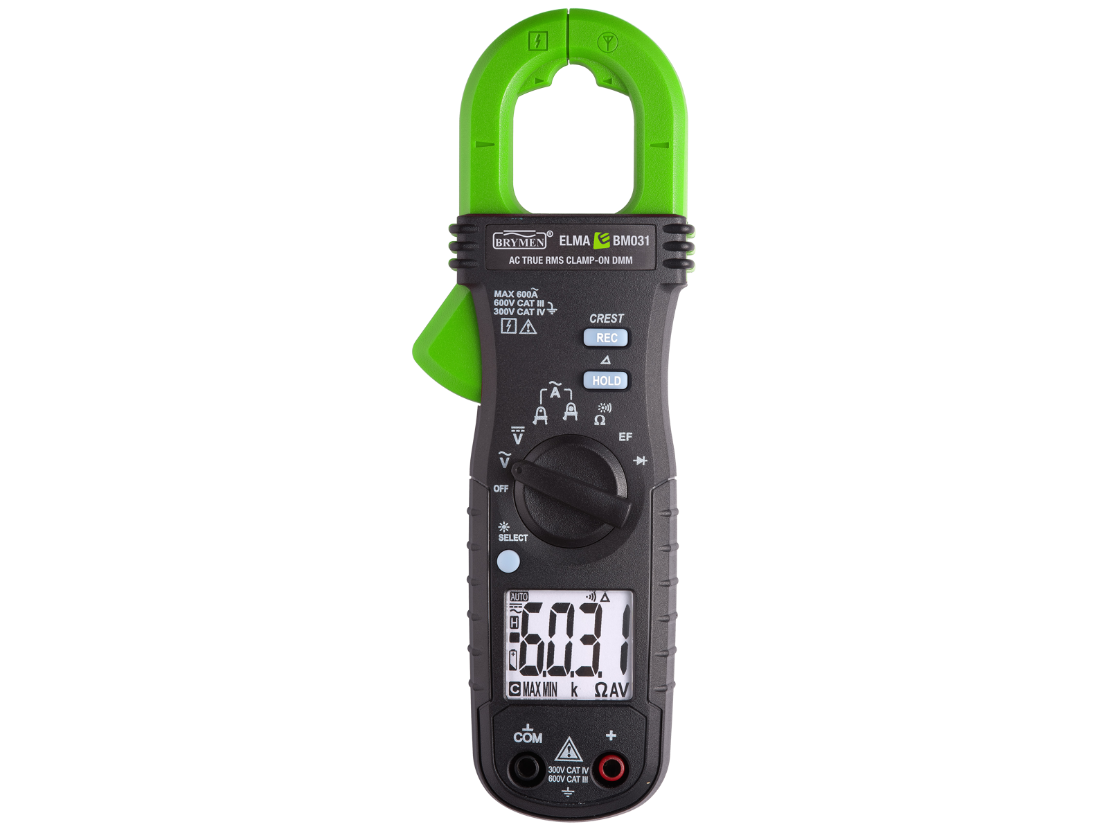 Med det handy tangamperemeter er det muligt, at måle strømme helt op til 600 A og multimeterfunktionen gør det muligt at måle spænding, modstand og gennemgang. AmpTip funktionen giver mulighed for at måle strømme i området fra 0-60 A med ekstra stor nøjagtighed. Elma BM031 er forsynet med belyst display, min./maks./relativ, datahold, peakhold samt berøringsfri spændingsindikering. Elma BM031 opfylder IEC 61010-1 KAT III 600 V/KAT IV 300 V. Opløsning 0,01-0,1-1 A. Nøjagtighed AC ± 1 % + 5D. Spænding AC/DC 0-600 V. Modstand 0-600 O-6k O. Gennemgangstest < 480 O akustisk signal. Tangvidde 26 mm. Batteri 2×1,5 V LR03. Leveres komplet i taske inkl. prøveledninger, batteri og dansk betjeningsvejledning.