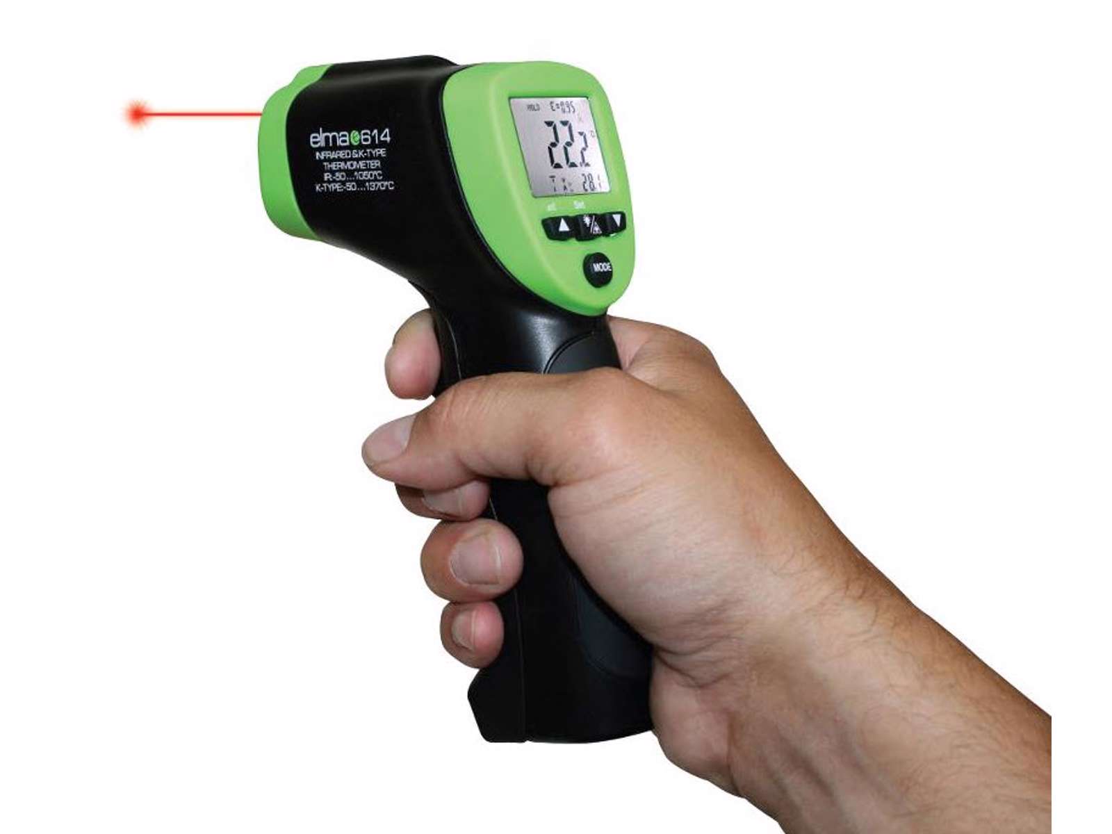Elma 614A er nyt professionelt dobbelt termometer som kombinerer fordelene ved et traditionelt termometer med det smarte og hurtigere infrarøde termometer. Infrarød måling er perfekt til måling på overflader mens det traditionelle type-k termometer er nødvendigt hvis der f.eks. skal måles kernetemperatur. Elma 614A har justerbar emissonsfaktor og er udstyret med belyst display, auto sluk, min/max/middel/differens funktion samt datalogger til 20 målinger. Type-k termometeret kan anvendes sammen med hele Elma´s program af følere til bl.a. luft, ventilation, overflade, væske og indstik. Som hjælpefunktion er Elma 614A udstyret med nyeste teknik hvor en smart dobbelt lasermarkør indikerer størrelsen af måleområdet så operatøren får en indikation på hvor der måles. Med omsætningsforhold 30:1 er Elma 614 ideelle løsning til måling på større afstand. Ved en afstand på en meter er måleområdet kun ca. 33mm. Instrumentet leveres komplet inkl. taske, trådføler, batteri og dansk betjeningsvejledni