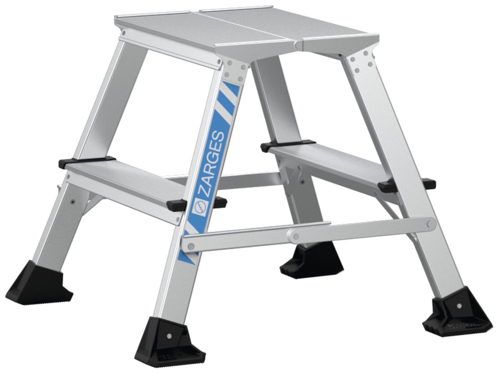 XL Step P er en praktisk og robust arbejdsbuk med platform på ca. 400×300 mm. Ekstra dybe, riflede trin (92 mm) for bekvem og sikker stabilitet. Lodret trinafstand 250 mm. Optimal stabilitet på grund af fast forbindelse i begge sider. Eloxerede vanger. Stigeskodesign af tokomponent-plast - også egnet til arbejde på gitterristflader. Belastning op til 150 kg. Opfylder standarden EN 14183.