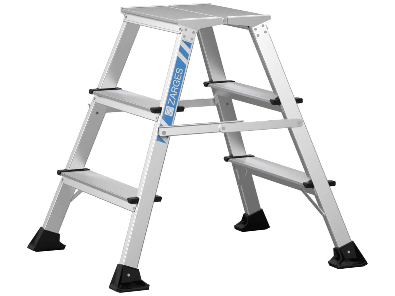 XL Step P er en praktisk og robust arbejdsbuk med platform på ca. 400×300 mm. Ekstra dybe, riflede trin (92 mm) for bekvem og sikker stabilitet. Lodret trinafstand 250 mm. Optimal stabilitet på grund af fast forbindelse i begge sider. Eloxerede vanger. Stigeskodesign af tokomponent-plast - også egnet til arbejde på gitterristflader. Belastning op til 150 kg. Opfylder standarden EN 14183.