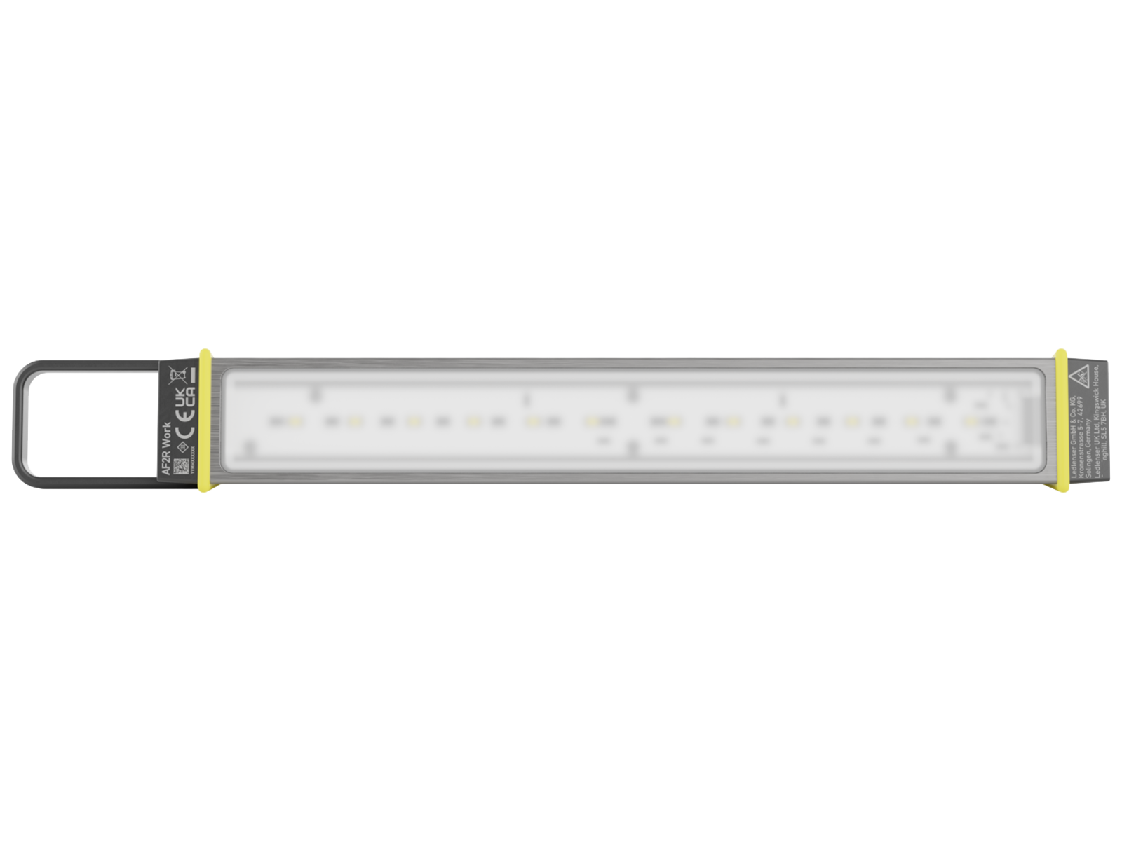 AF2R Work er en praktisk, kompakt arbejdslampe til brug i mange situationer. 5 lysstyrkeniveauer med hvidt lys, 2 lysstyrkeniveauer og blinkindstilling for rødt lys. Temperaturkontrolsystem beskytter LED'erne mod overophedning. Fleksibel montering med gummikrog, magnet, krog-og-løkke-stropper eller skruehul. Kraftfuldt batteri: nem genopladning med USB-C. Robust aluminiumshus med integreret lineal og skridsikker stødbeskyttelse. IP54.