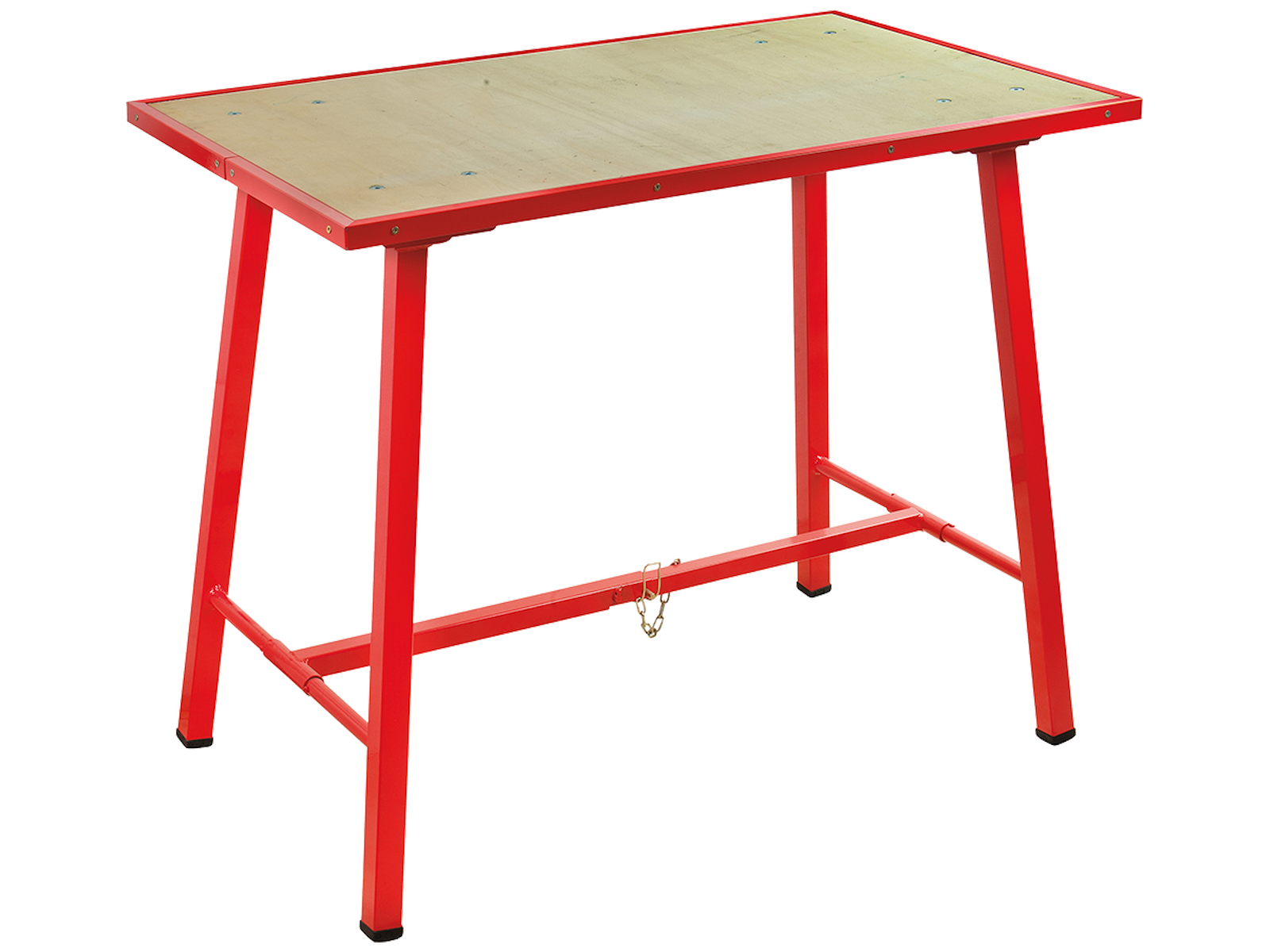 Mondelin arbejdsbord med foldbare ben. Robust design og solide materialer. 25 mm bordplade af PEFC-certificeret træ og bordben i 35×35 mm stålrør sikrer en stærk og stabil konstruktion. Skridsikre gummifødder giver et fast underlag og boltede bordben øger sikkerheden. Med en maksimal belastning på 150 kg og en vægt på kun 16,1 kg er bordet både robust og let at håndtere – ideelt til værksteder, montage og byggepladsen.