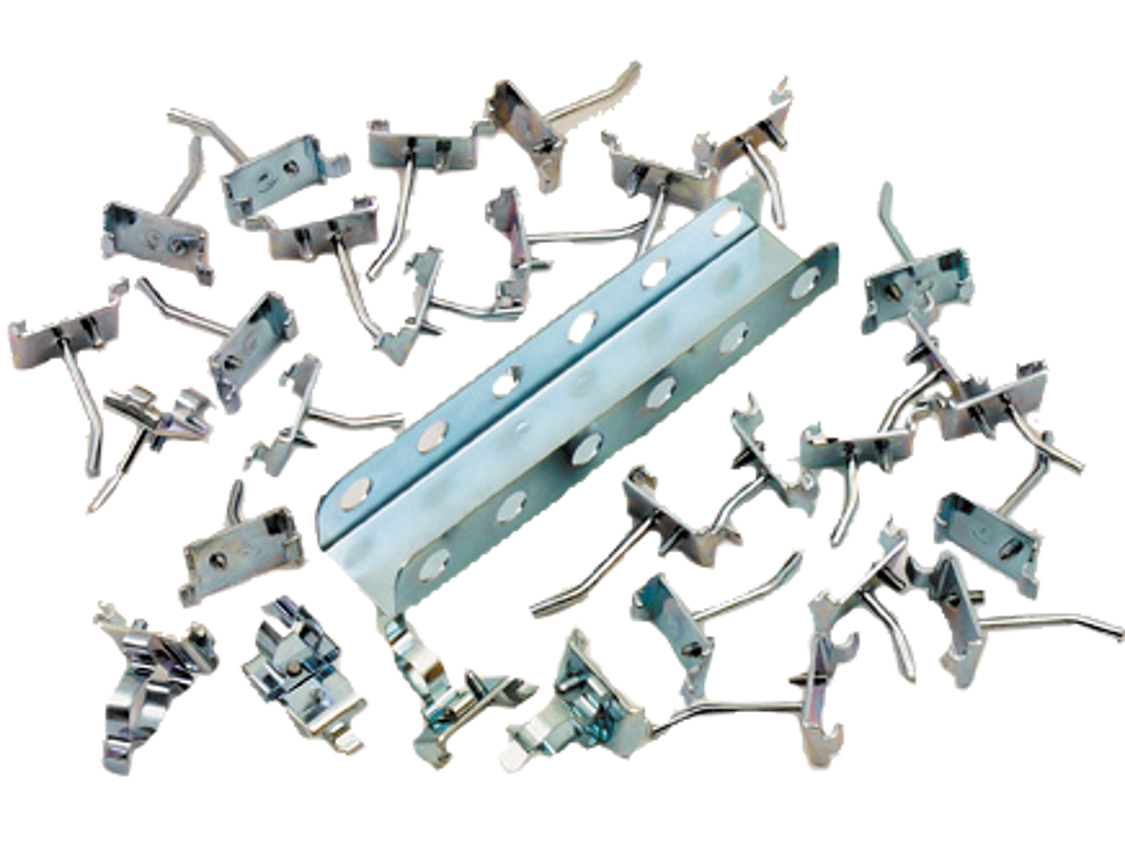 Ophængssortiment til værktøjsborde, materialeskabe, værkstedsvogne og til allround brug. OS-96 med i alt 30 ophæng (kroge: 10 × 1015 og 15 × 1016, fjederklemmer: 2 × 1084 og 2 × 1085, skruetrækkerholder: 1 × 1113-6-13).