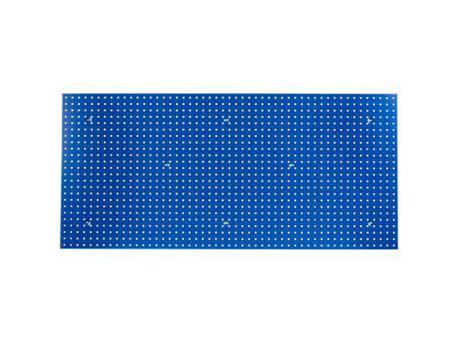Perforeret værktøjspanel til vægmontering. Pladetykkelse 1,5 mm. Hold fast. Ø9 mm. Hulafstand c/c 38 mm. 14 mm bukket kant hele vejen rundt. Farve blå RAL 5005.