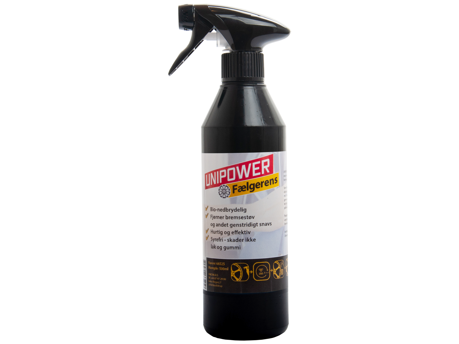 Unipower fælgerens fjerner den mest genstridige snavs med minimal arbejdskraft og virker optimalt modbremsestøv, olie, gummi og generelt snavs fra vejen. Spray fælgerens på i et jævnt ensartet lag, gerne fra en afstand på mellem 15-25 cm. Lad produktet virke i ca. 3 min. Herefter afskylles og vaskes fælgene med vand - gerne med en kraftig stråle. Kan også aftørres med ren tør klud. For bedste resultat anvend vand og børste efter påførelse og eventuelt inden bilen køres i maskinvask. Produktet er bionedbrydeligt og garanteret syrefri, det angriber derfor ikke lakeringen og metallet på fælgene, bremsedele eller hjulbolte. Omrystes før brug.