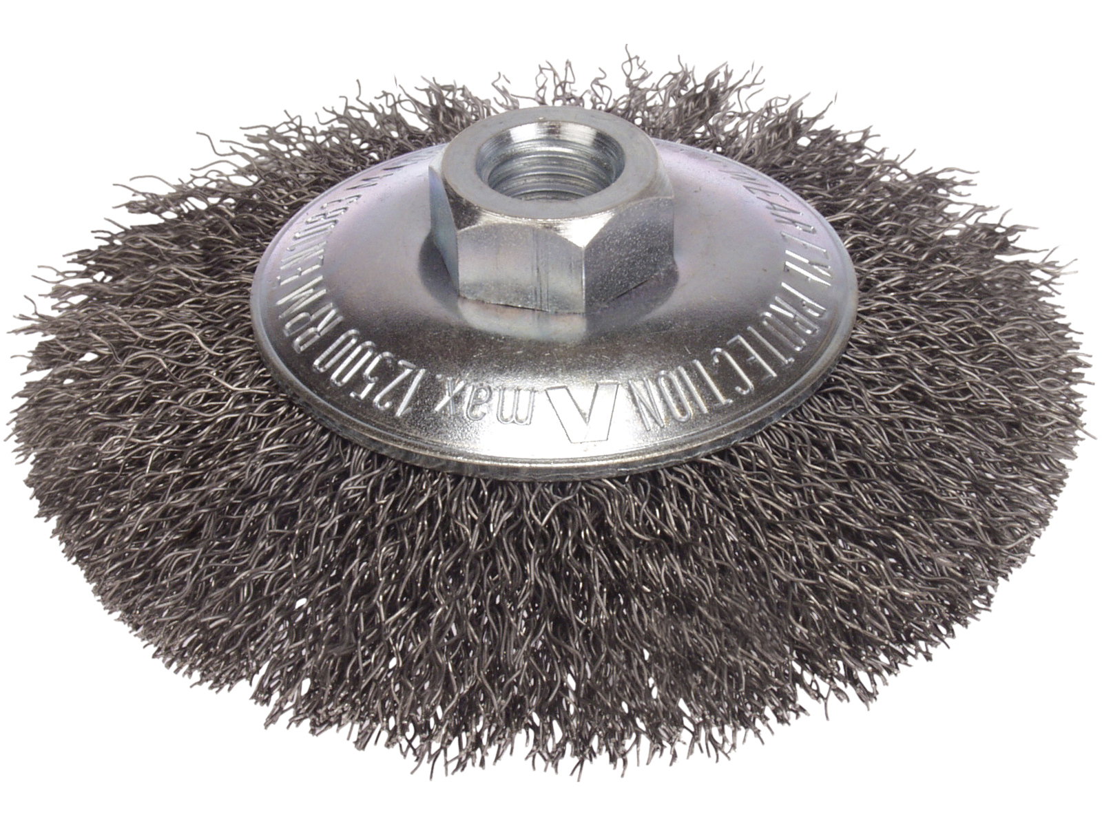 Keglebørste 100 mm, M14 gevind, 0,35 mm tråd. Fås i flere varianter.