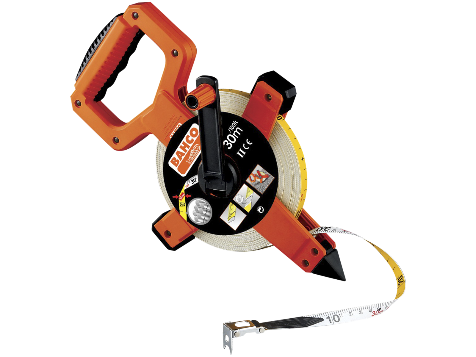 Båndmål med ramme. Klasse II. Komfortabelt gummigreb passer perfekt i hånden, samt langt håndsving for lettere båndoprulning. Glasfiberbånd med nylonbelægning og stålruller deråforhindrer båndet i at sno.
